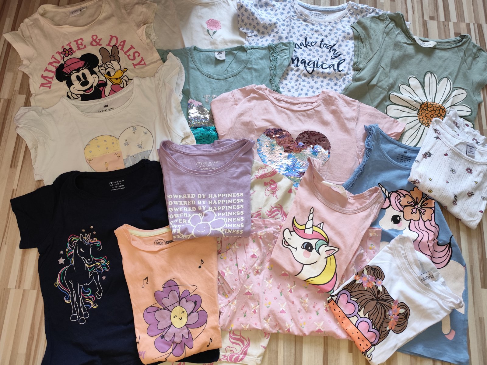 Tri ka v perfektnom stave,niektoré nenosené,niektoré oblecene 2x.Velkost 122/128. Väčšinou H&M ale aj Takko,kik,primark,Pepco asi len jedno.19 ks tričiek ( dve som zabudla doložiť).Ak treba pofotim aj po jednom. Cena je za všetko.