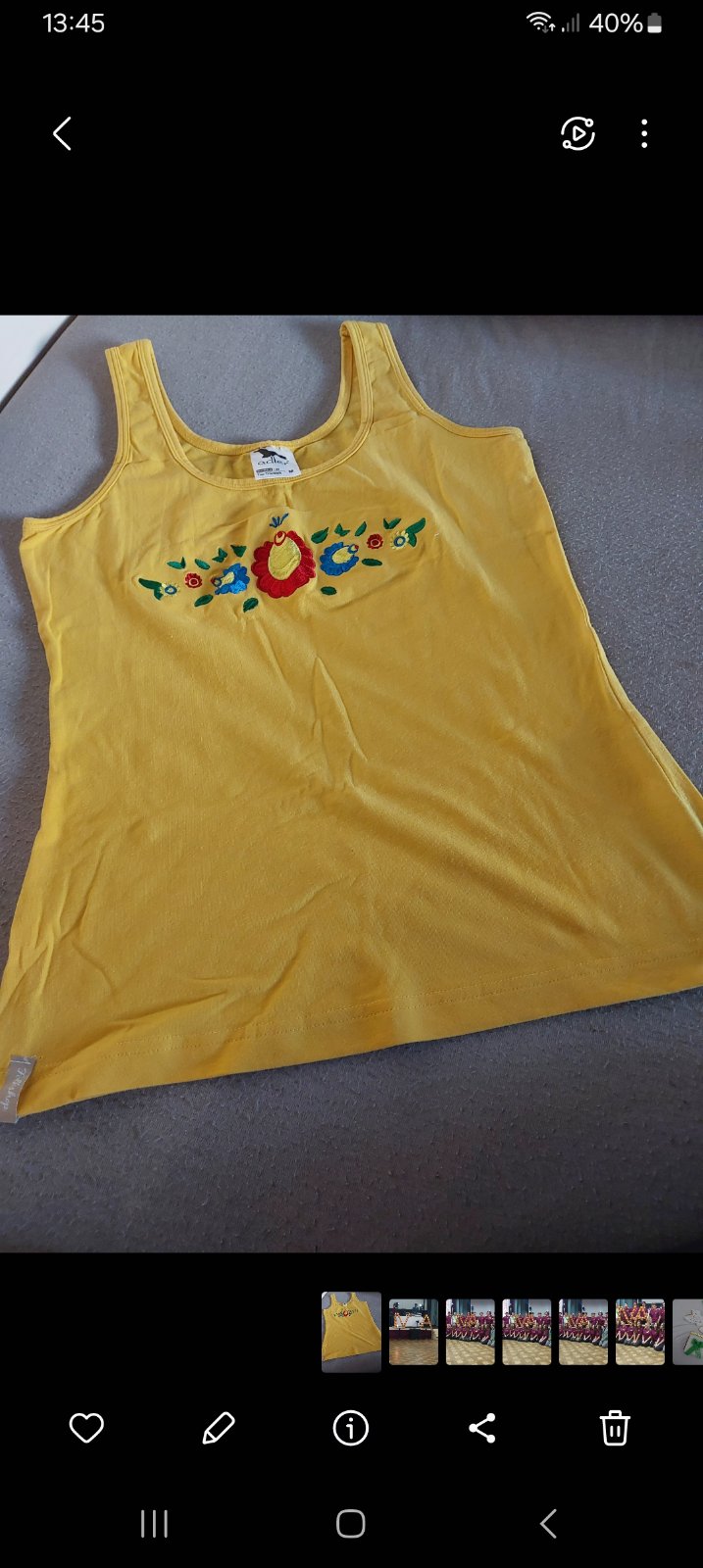 Bavlnené žlté tielko s farebnými nápismi, bezchybné. Dlžka 60 cm, šírka 41 cm.