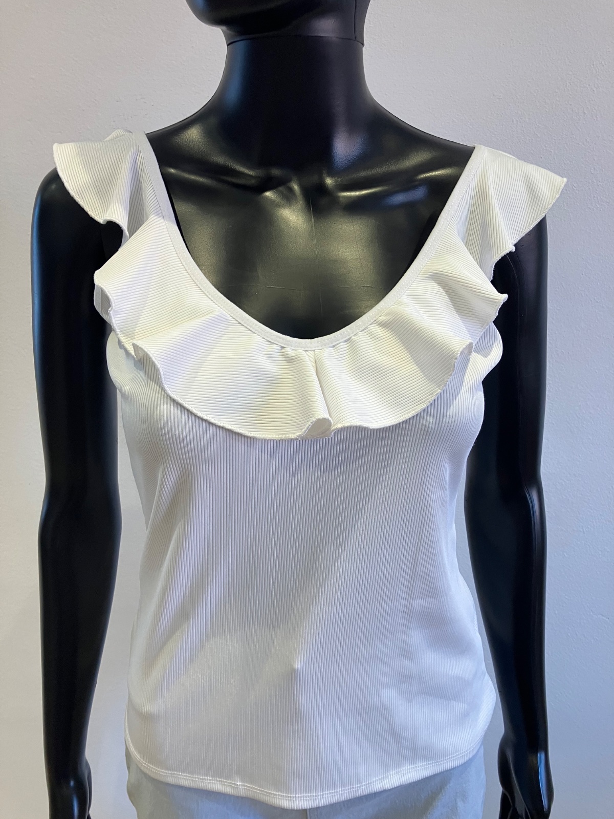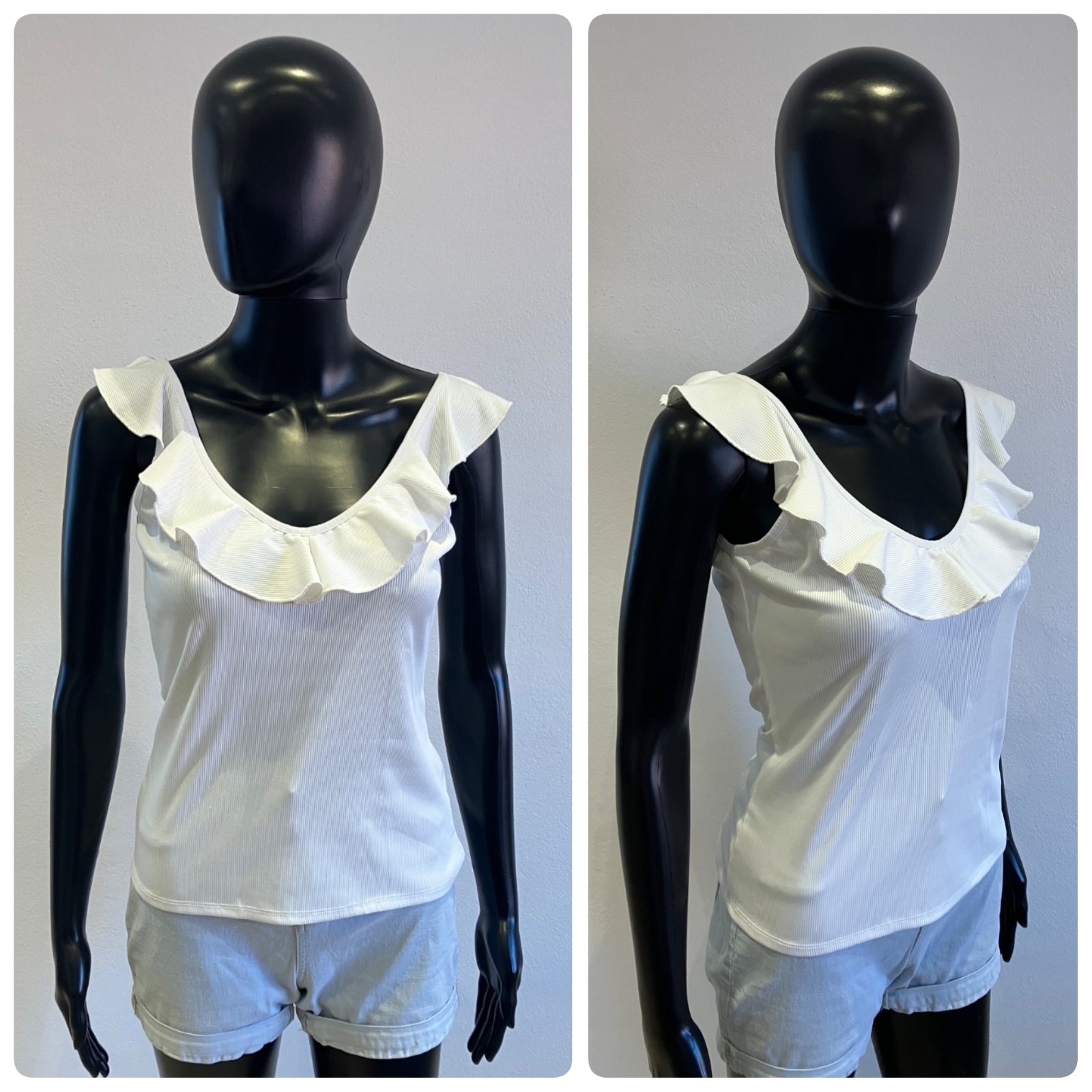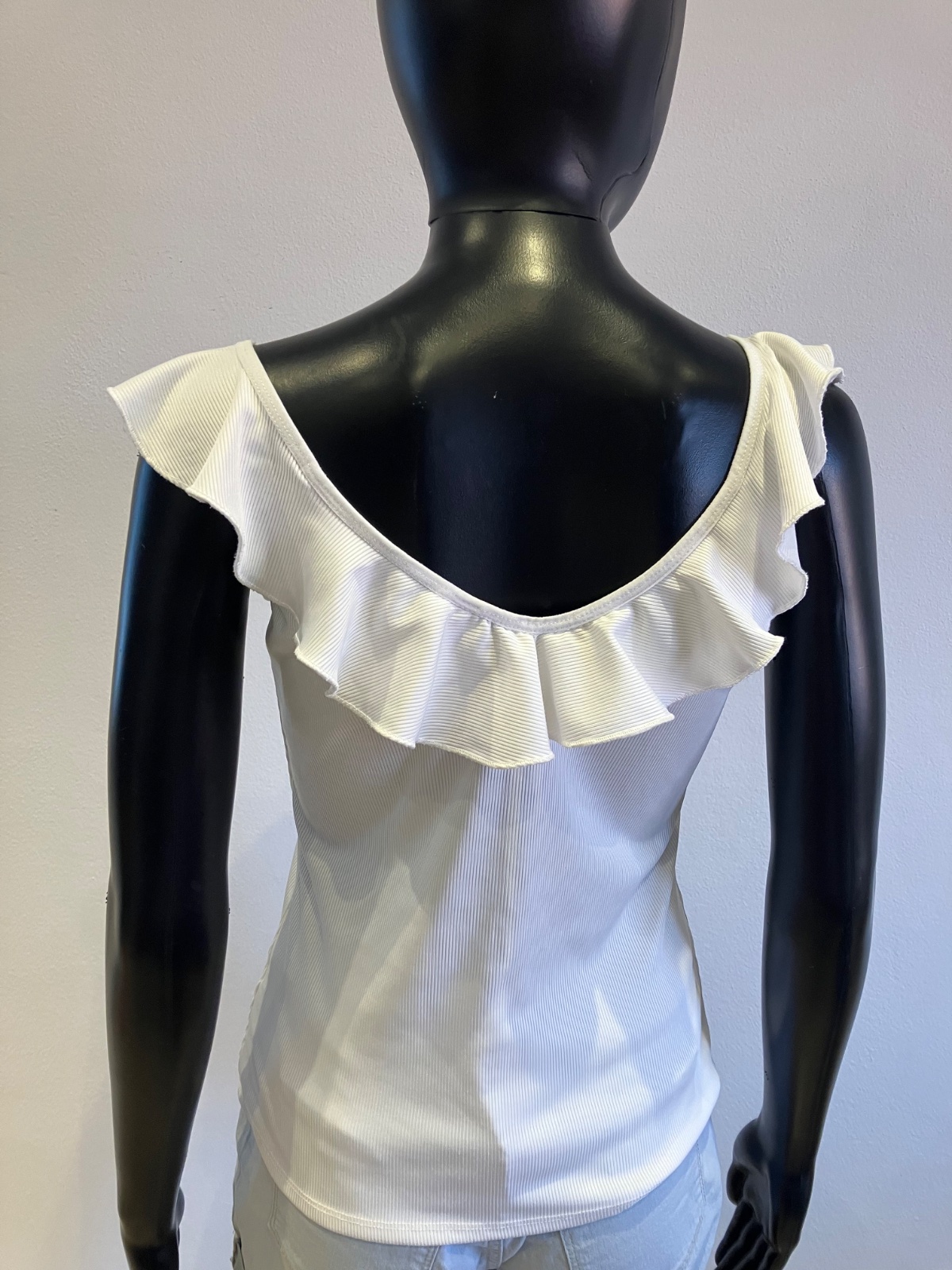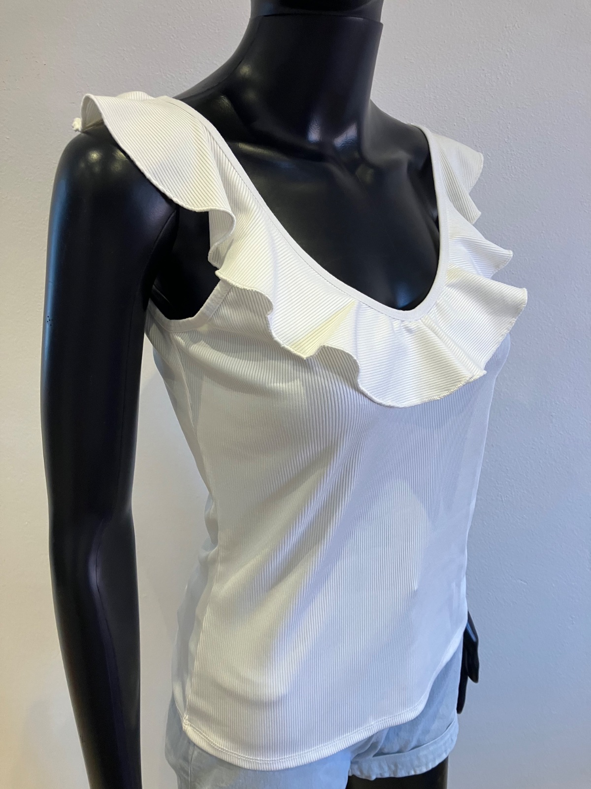 Dámske biele tričko bez rukávov, véčkový výstrih, rebrované, s volánom, elastické, veľkosť cca S.