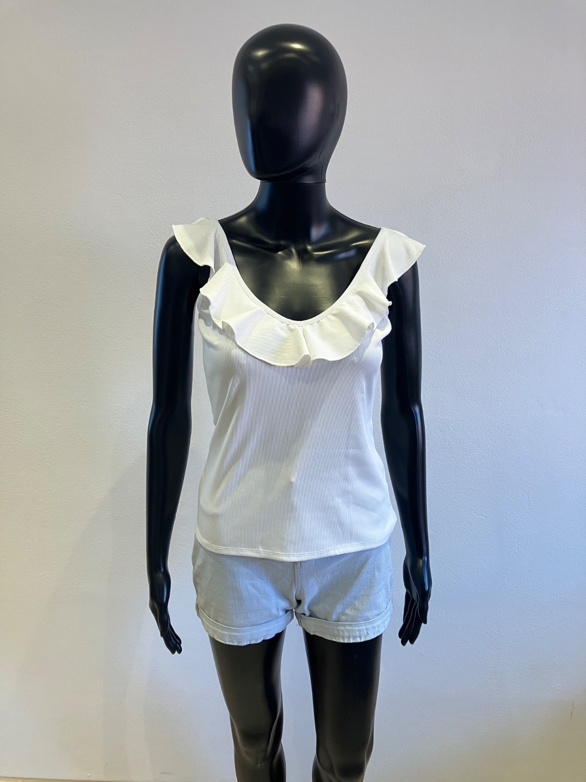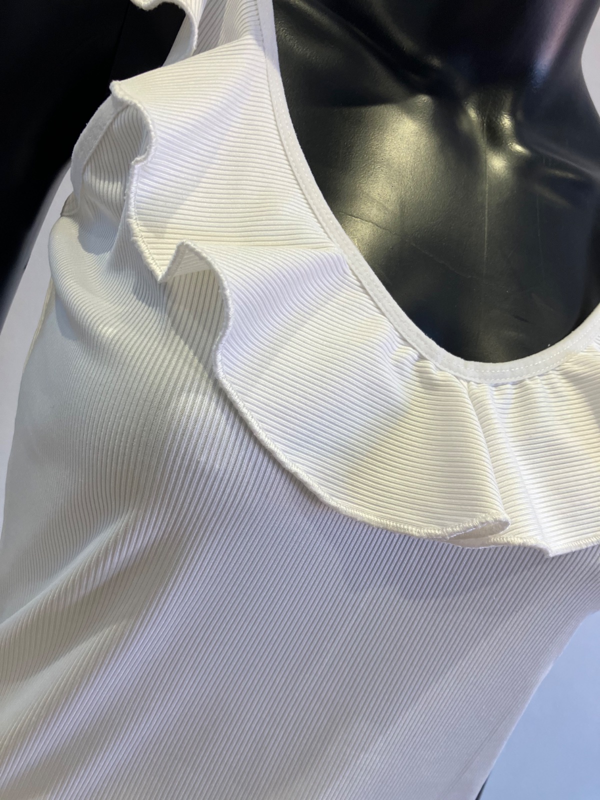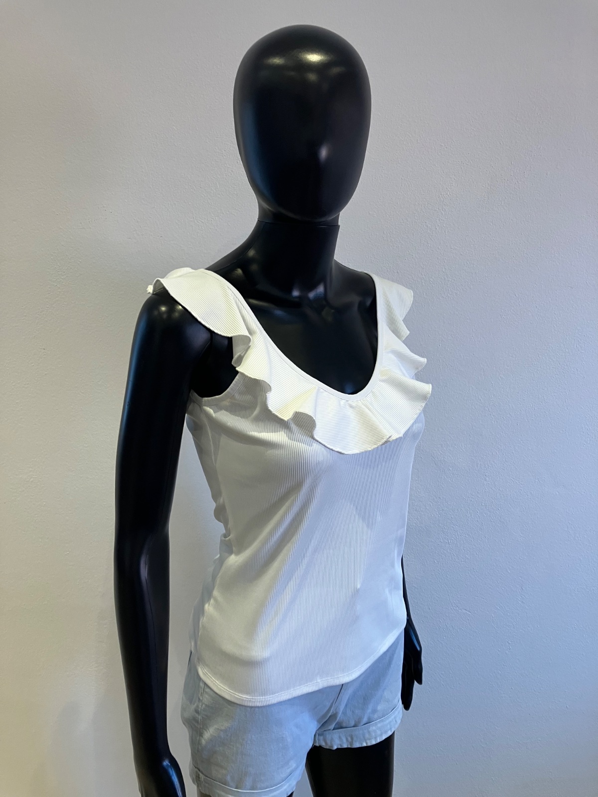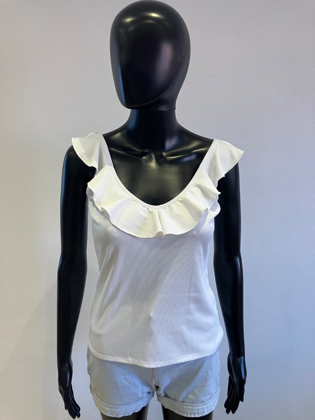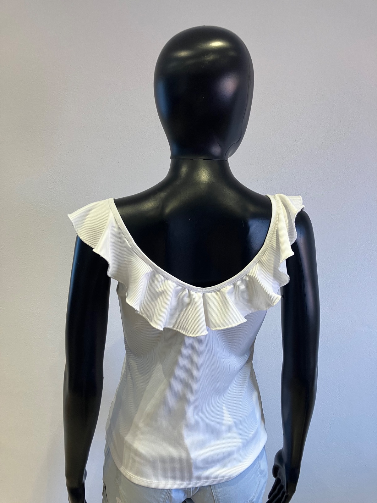 Dámske biele tričko bez rukávov, véčkový výstrih, rebrované, s volánom, elastické, veľkosť cca S.
