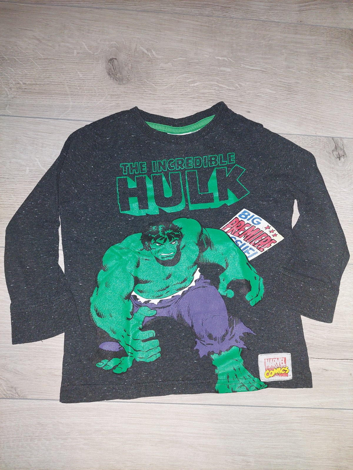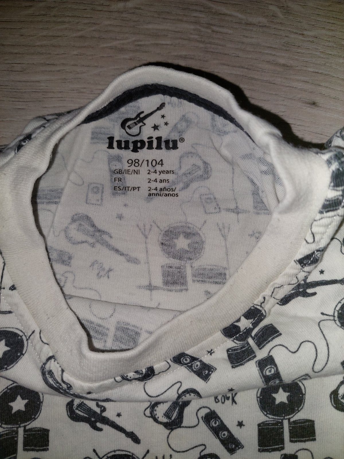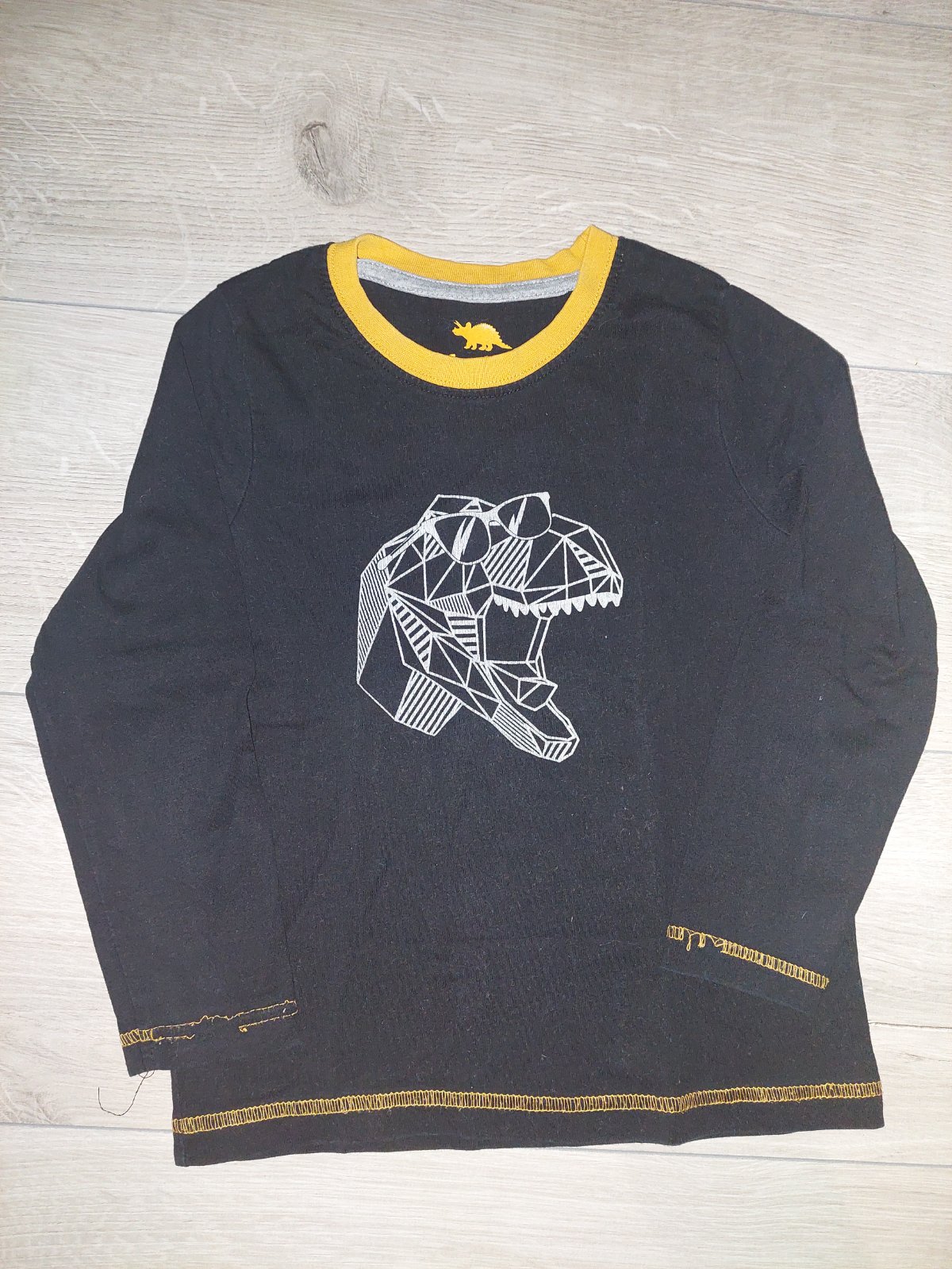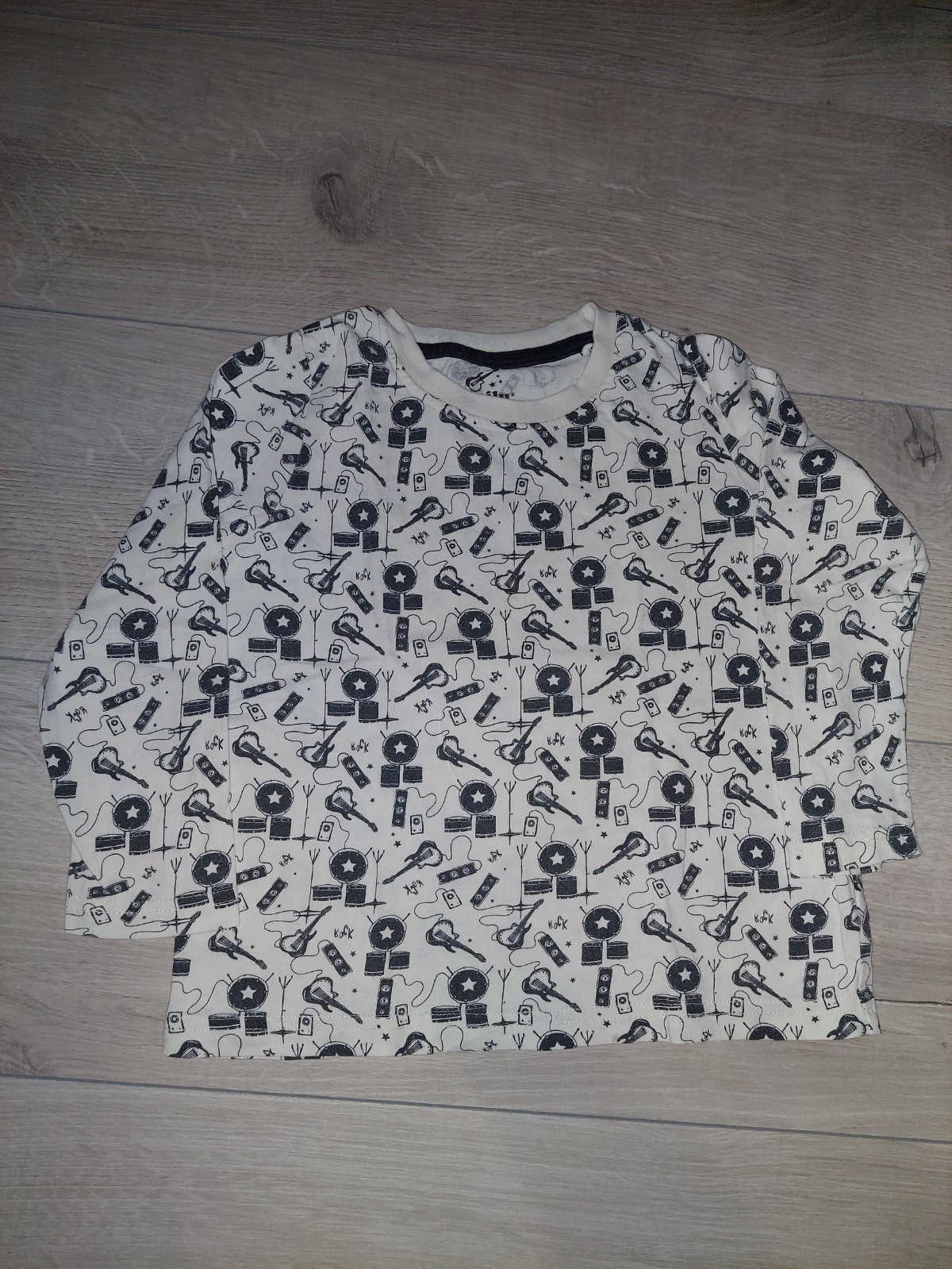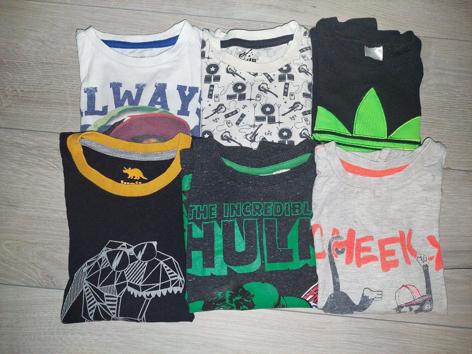 Sada tričiek s dlhým rukávom. Čierne tričko s dinosaurom vo veľkosti 98/104, značka Lupilu. Biele s hudobnými nástrojmi veľkosť 98/104, značka Lupilu. Čierne so znakom vo veľkosti 98. Slabošedé s opičkami vo veľkosti 104, značka F&F. Tmavošedé s Hulkom vo veľkosti 104, značka Marvel Cosmics. Biele vo veľkosti 98, značka F&F.