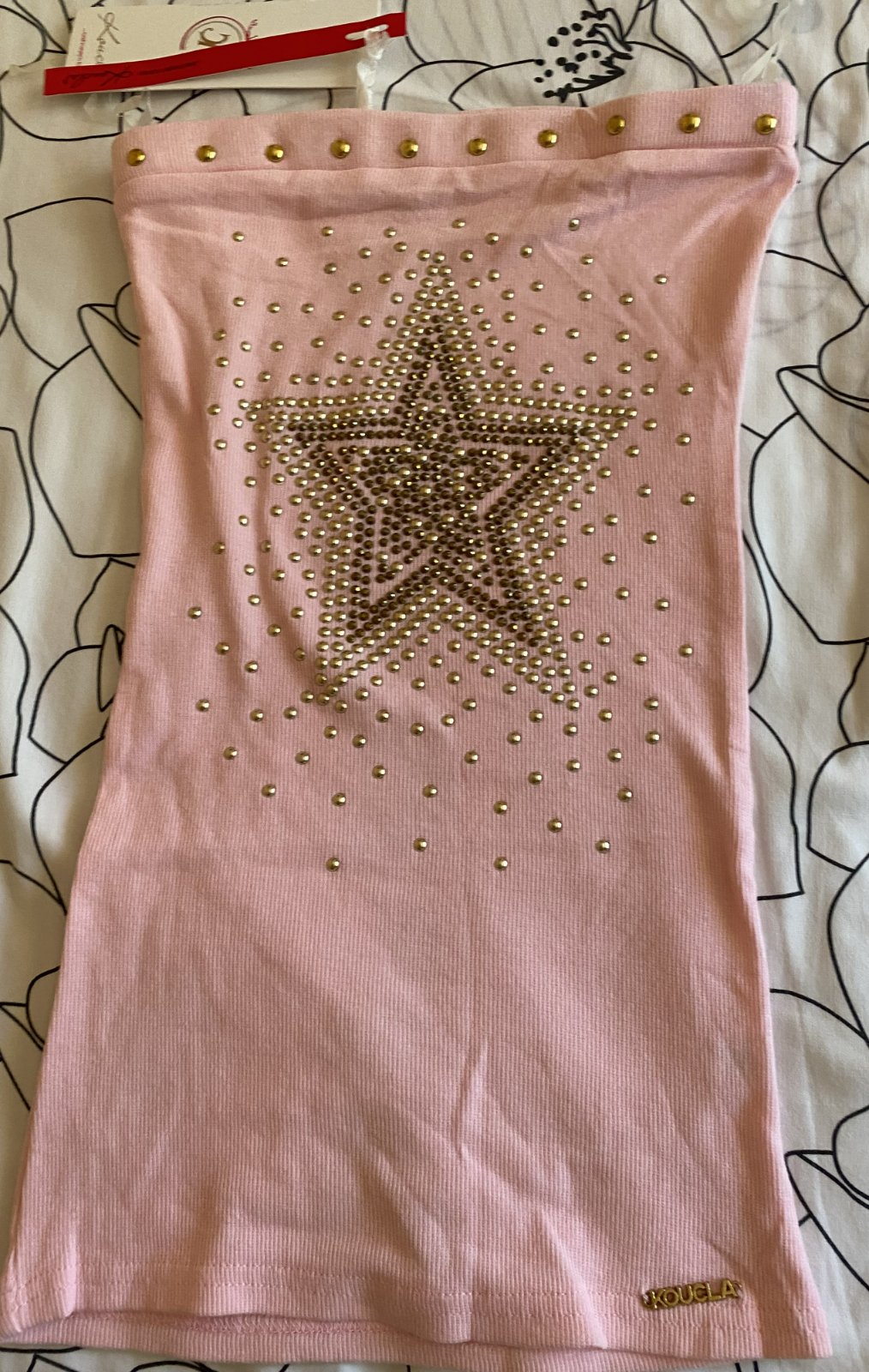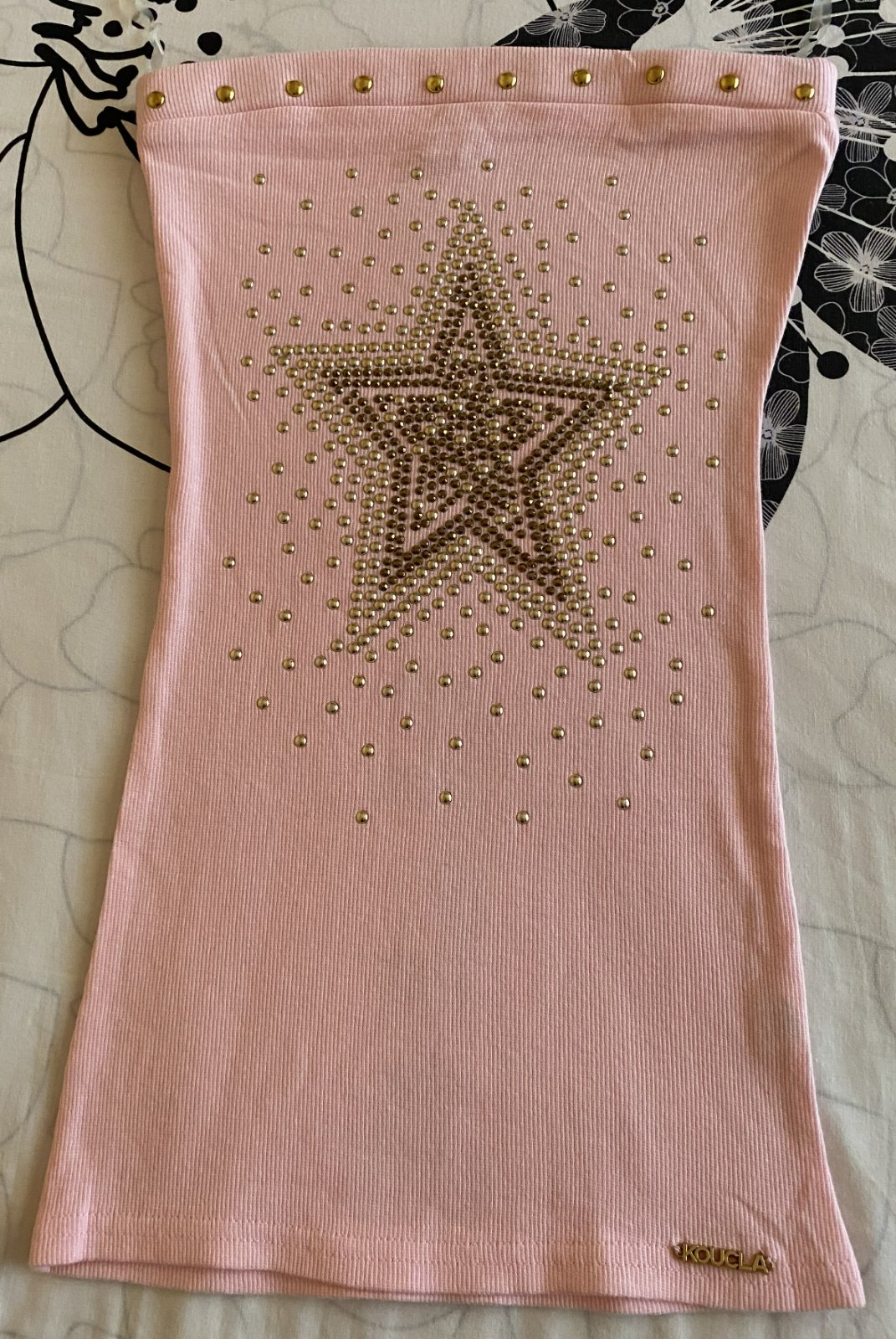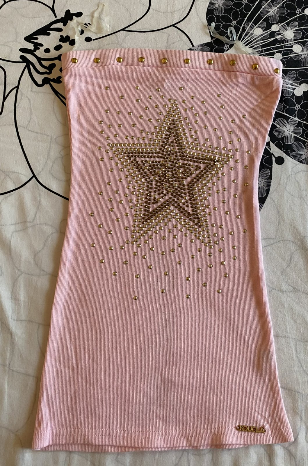 Bavlnené vrúbkové tričko - top bez ramienok KOUCLA v. S, nenosené, iba opraté, ešte mám k nemu aj visačku, materiál 100% bavlna - rebrový vzor, pružný materiál, v hornej časti širšia guma, aplikácie vpredu aj vzadu, pekná bledoružová farba (niektoré foto osvietené). Miery: dĺžka: 50cm, šírka hore: 31-36cmx2 (navlečená širšia guma).