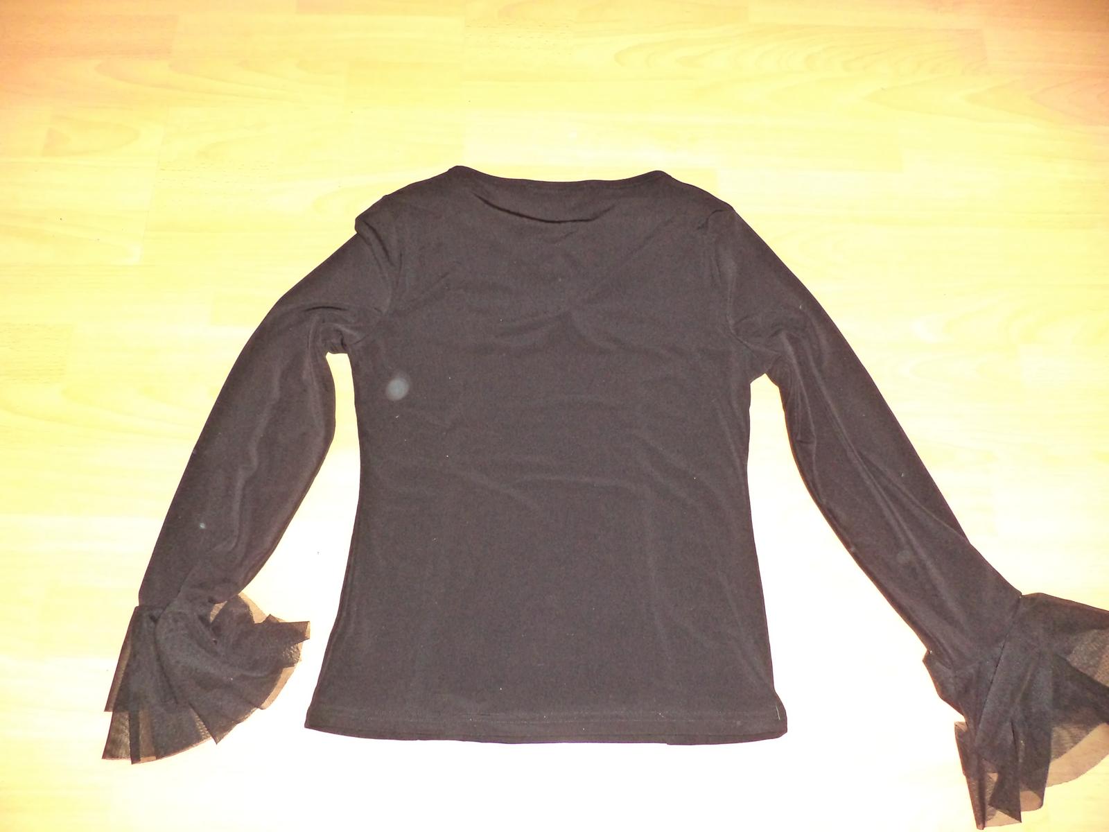 Predam pekne damske elasticke tričko s dlhym rukavom, zakončene tylovym volanom , 1x oblečene v predu aplikacia zo štrasovou sponou dlžka 59cm , dlžka rukavas volanom 6ťcm obvod hrude 88cm