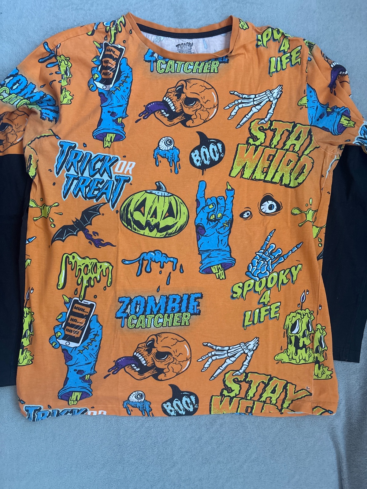 Predám tričko s krátkym rukávom. Obrázok bez poškodenia. Bez poškodenia. V top stave. Zloženie: 100% bavlna Farba: oranžová, čierna Motív: Dinosaurus Značka: F & F Veľkosť: 13-14 rokov Dĺžka rukáva...
