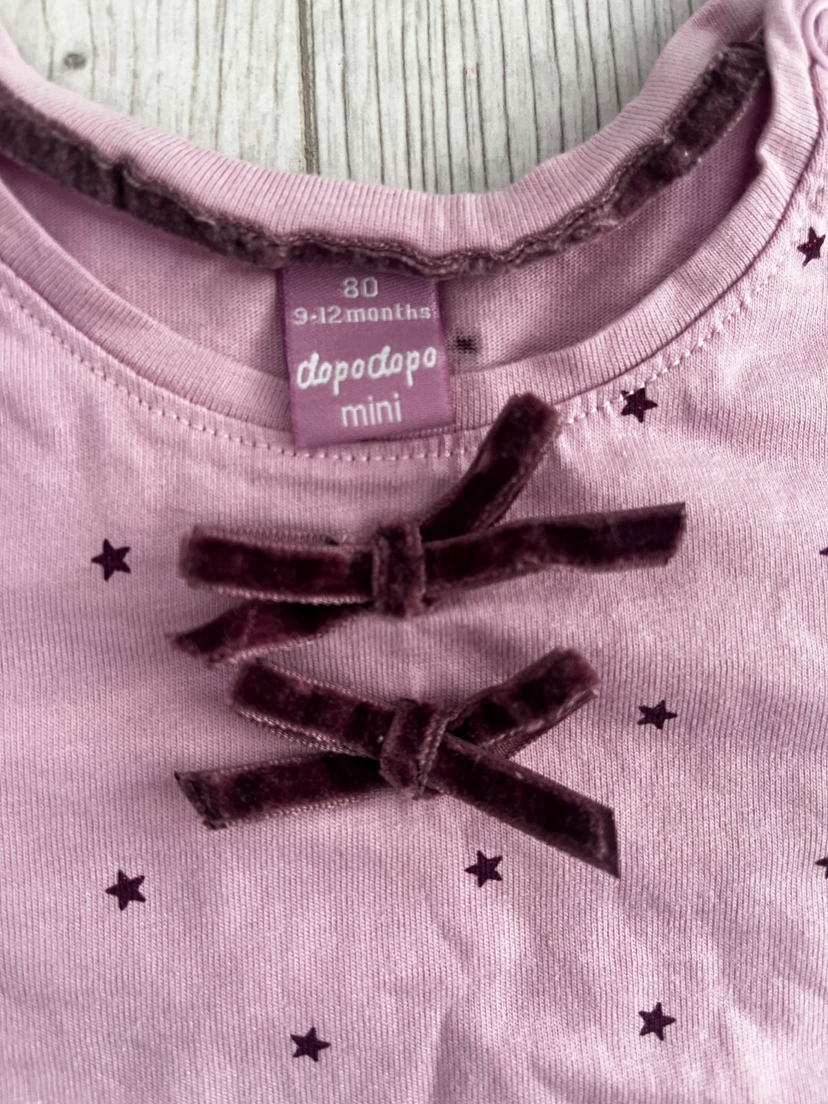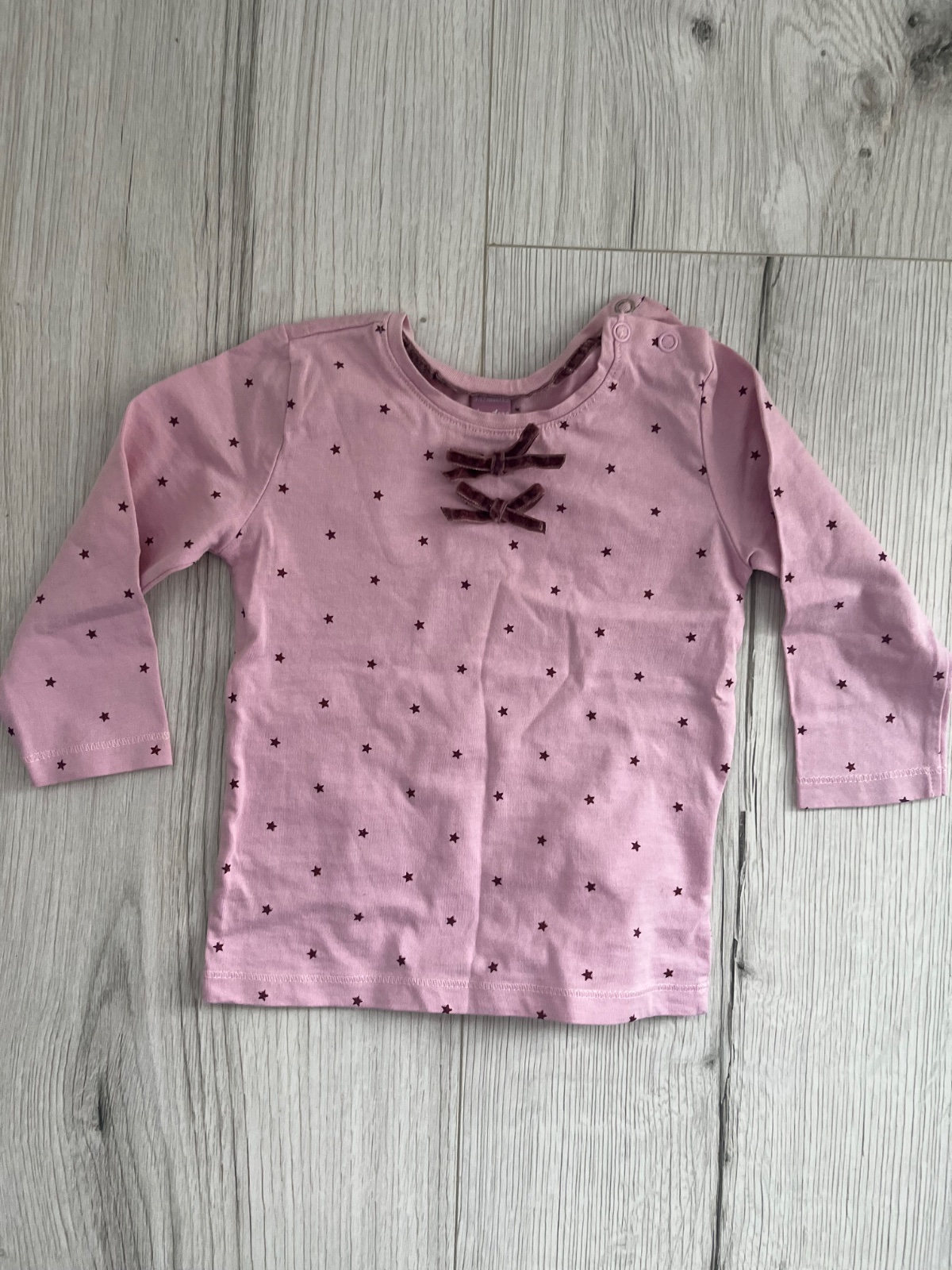 Predám bledofialove dlhorukavove tričko s hviezdičkami a dvoma zamatovými maslickami značky Dopodopo, veľkosť: 80 (9-12 mesiacov)
