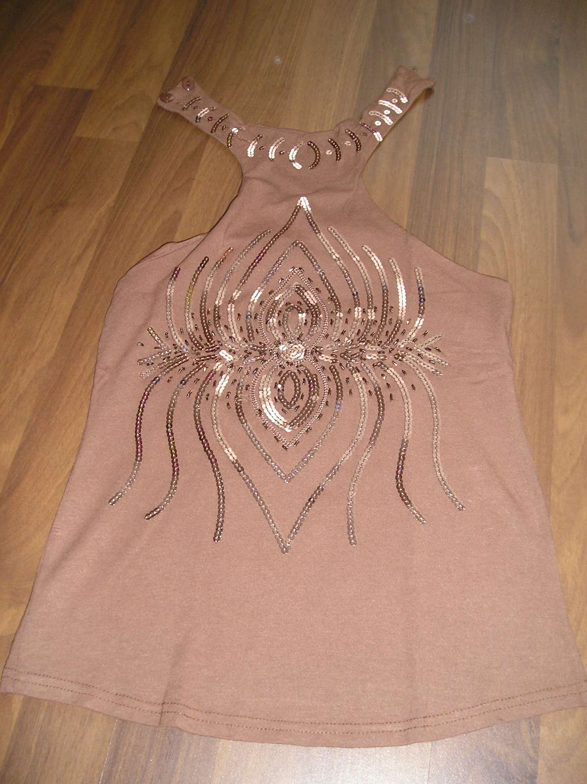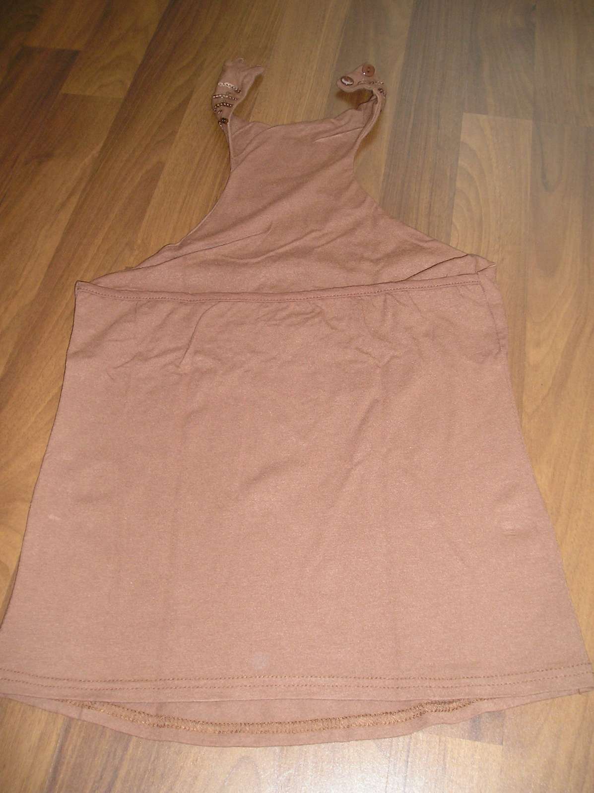 Bledučkohnedé tielko s uväzovaním okolo krku na 2 gombíky, vpredu pekná aplikácia z flitrov, dlžka predný diel od krku 52 cm, dĺžka zadný diel 30 cm, pás 2x 34 cm, elastické
