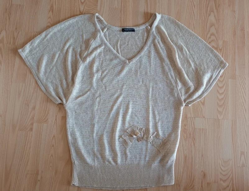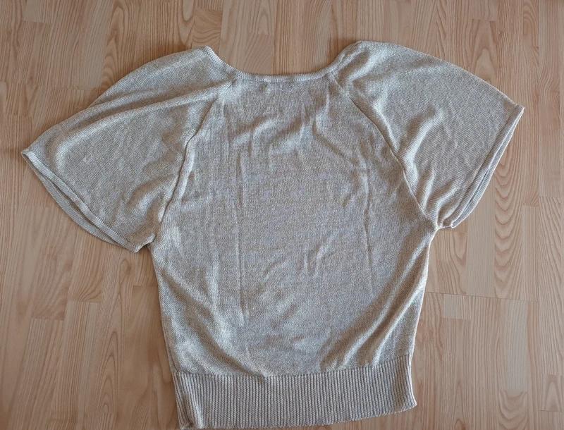 Úpletové tričko béžovej farby poprepletané zlatou niťou, talianska značka Rinascimento, nenosené... veľkosť označená XS, no je to volný padavý strih, kľudne aj v.M.. dlžka 68cm, šírka 48cm