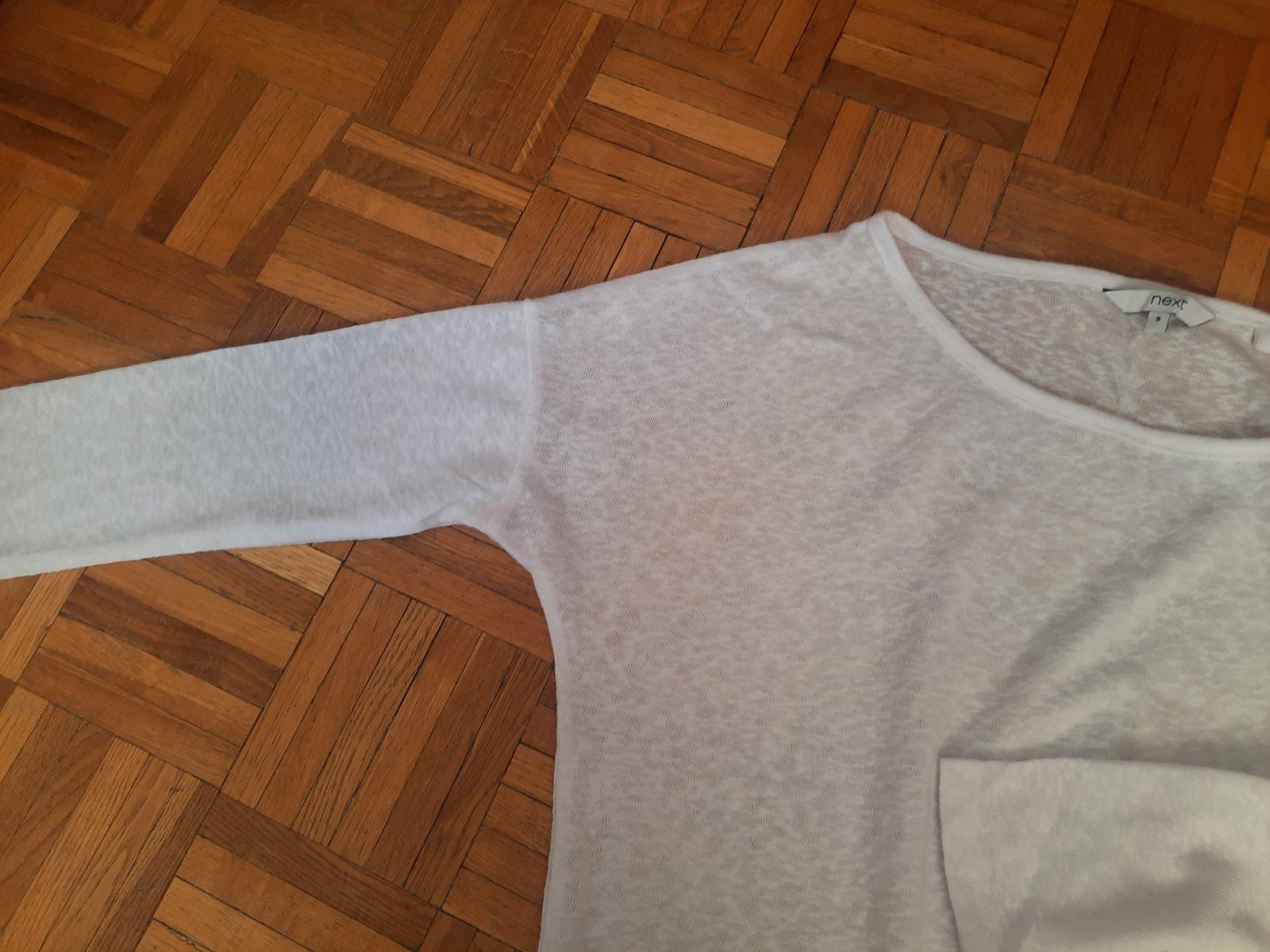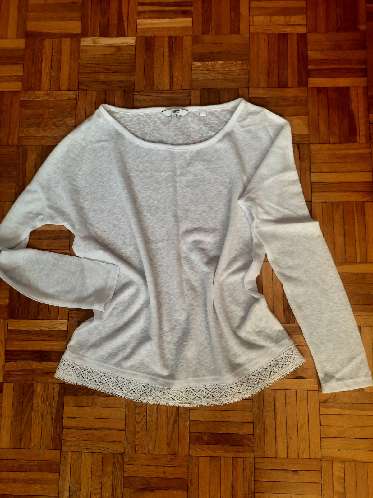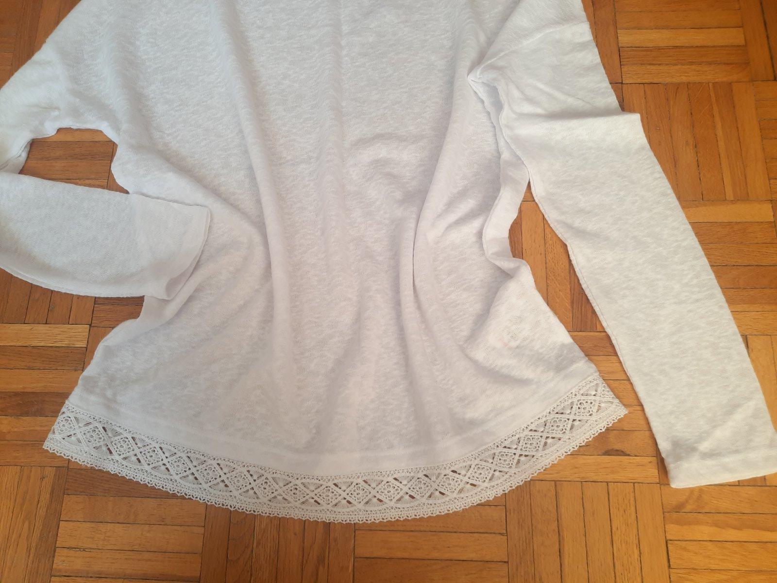 Krásny snehovo biely top s netopierim rukávom. Na spodku ozdobná "krajka". Príjemný, tenší materiál. Má ležérny, voľnejší strih. Veľkostne sedí aj na M podľa mňa. Bol iba vypratý.