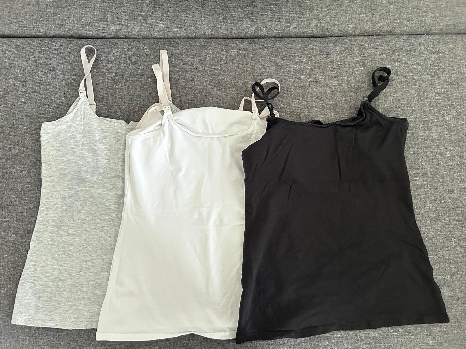 Predám 3 tielka na dojčenie. Použite párkrát. Omylom som biele a šedé tielko dala prať spolu s farebnou bielizňou a tak sa mi ramienka zafarbili do bledoružova. Inak bez poškodenia.
