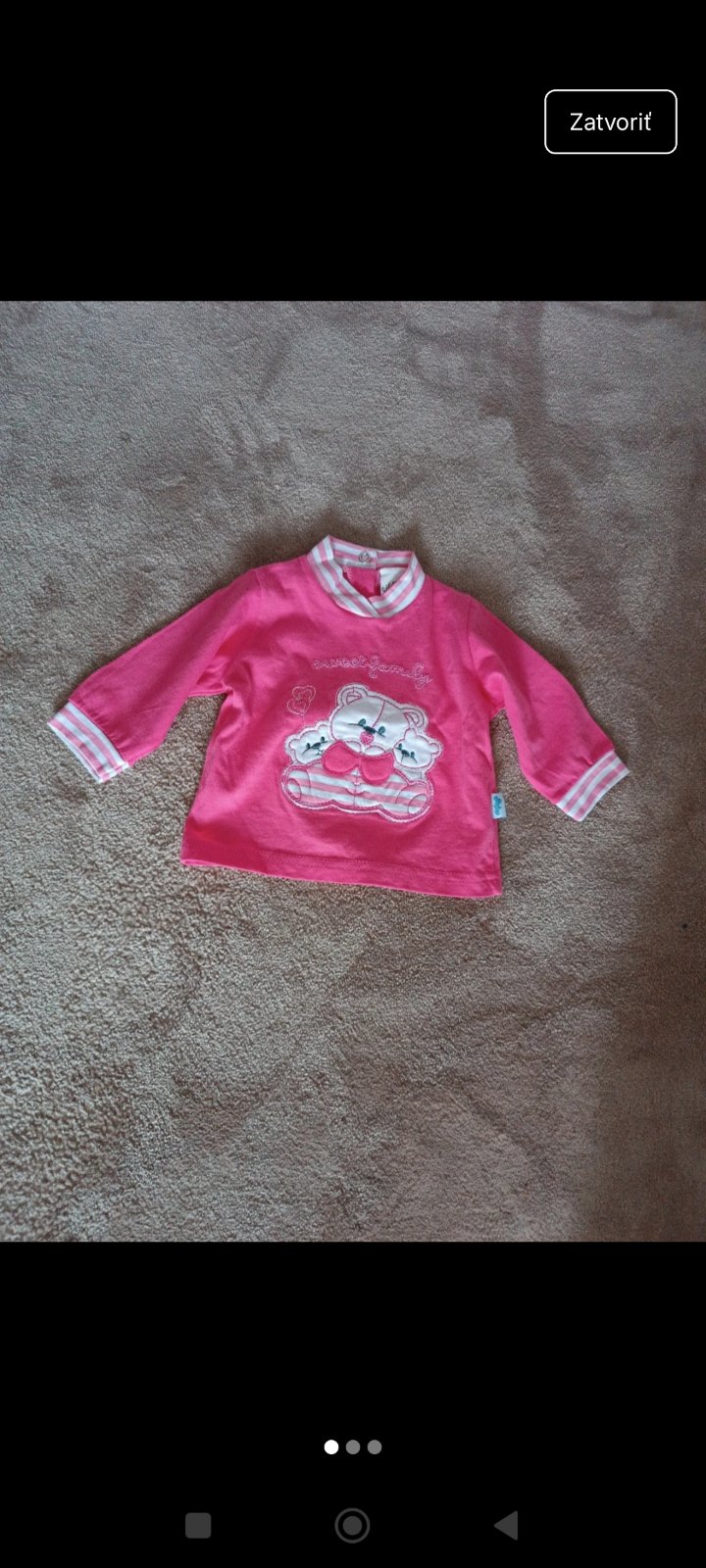 Predám minimálne nosené tričko pre dievčatko zn."Cherokee".Bolo oblečené dvakrát,takže je v perfektnom stave,bez chýb.Máme toho veľa nestíhame vynosiť.Vek je uvedený na etikete 0-3 mesiacov,ale dá ...