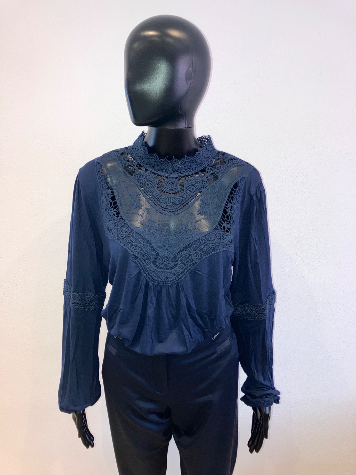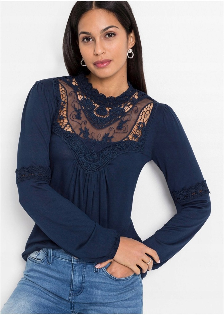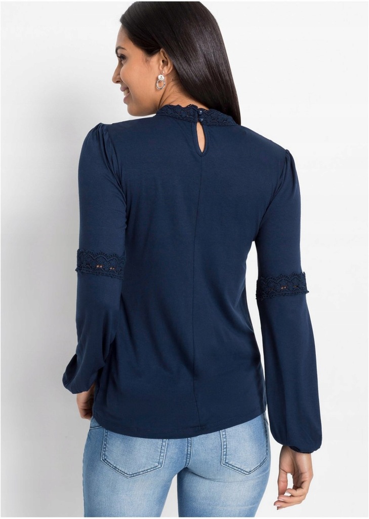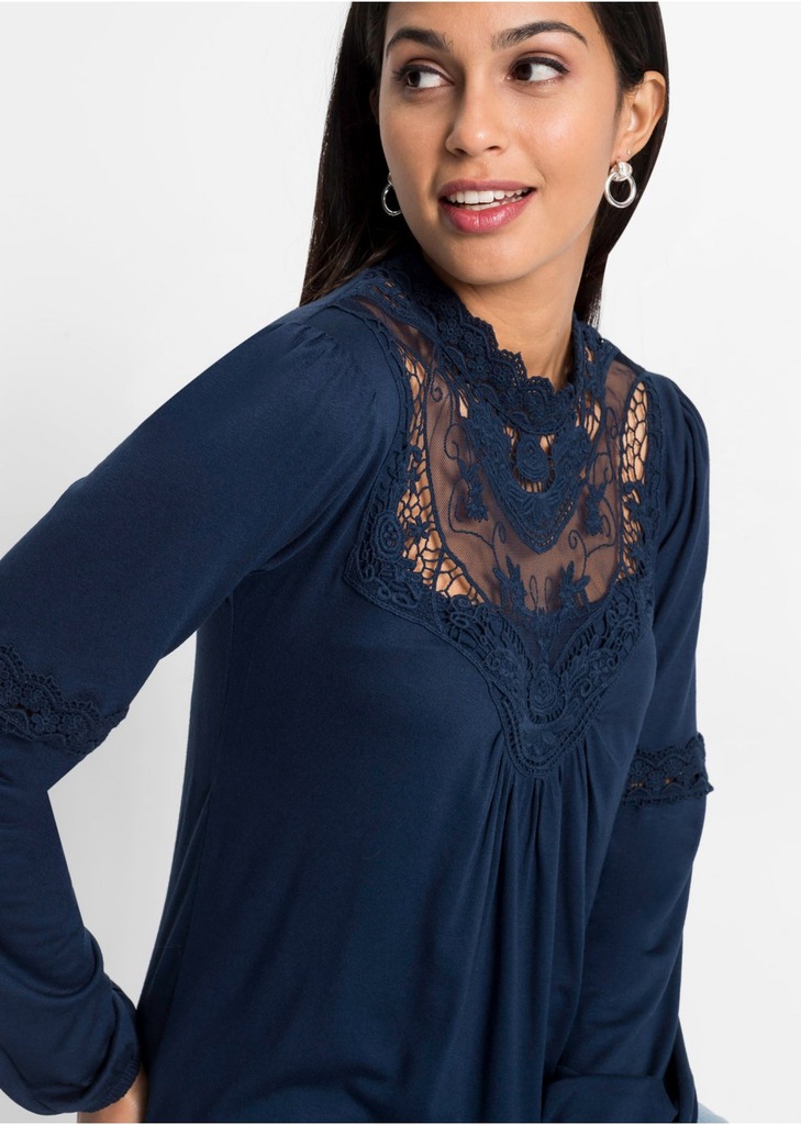 Dámske tmavomodré tričko s dlhým rukávom, čipkovaný výstrih so stojačikom, ukončenie rukáva na gumičku, elastické. Hodí sa k džínsom a podpätkom a sukni.