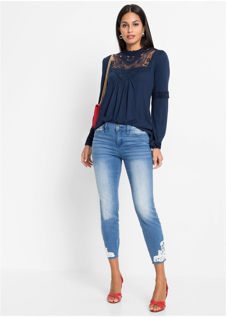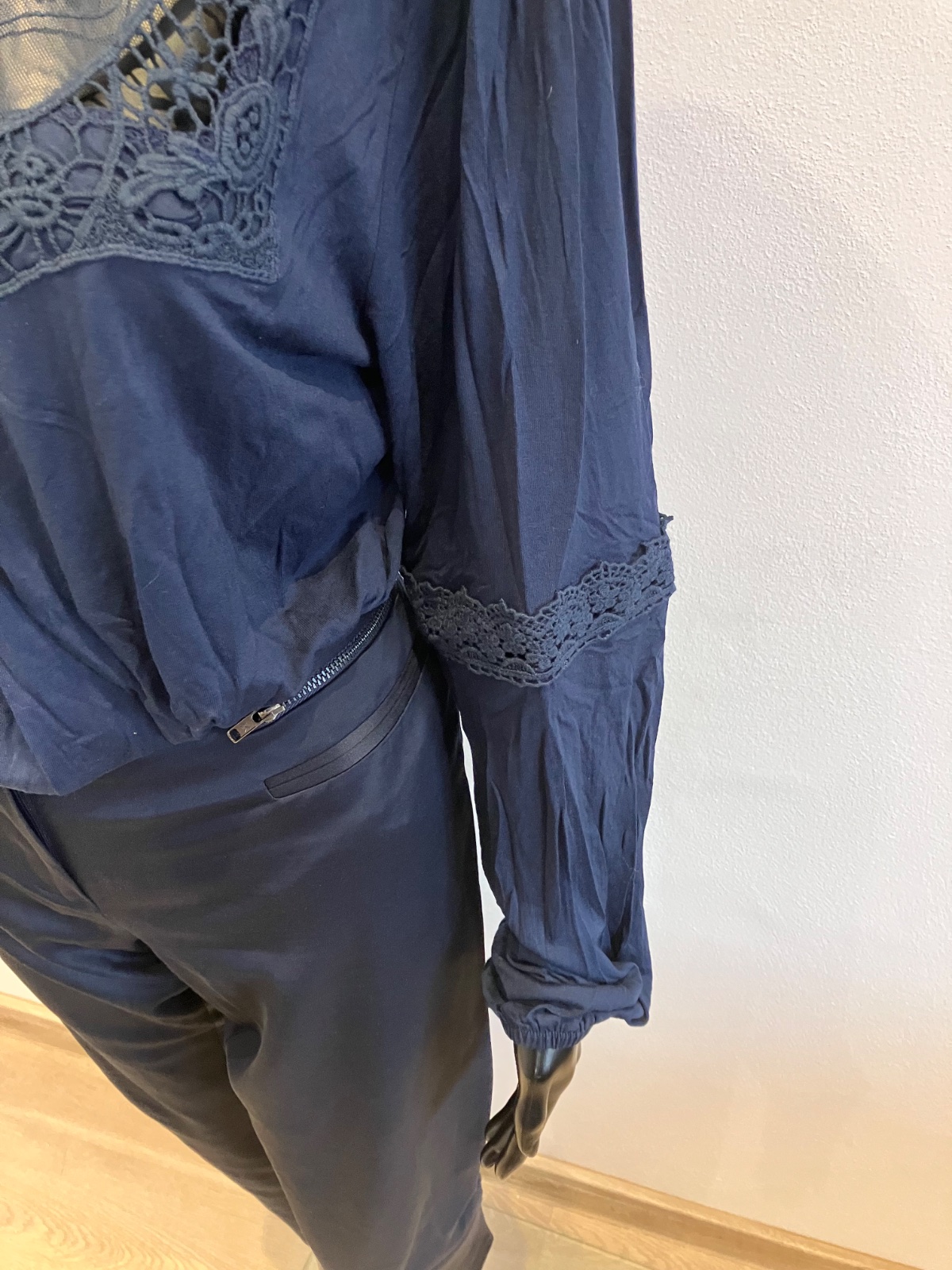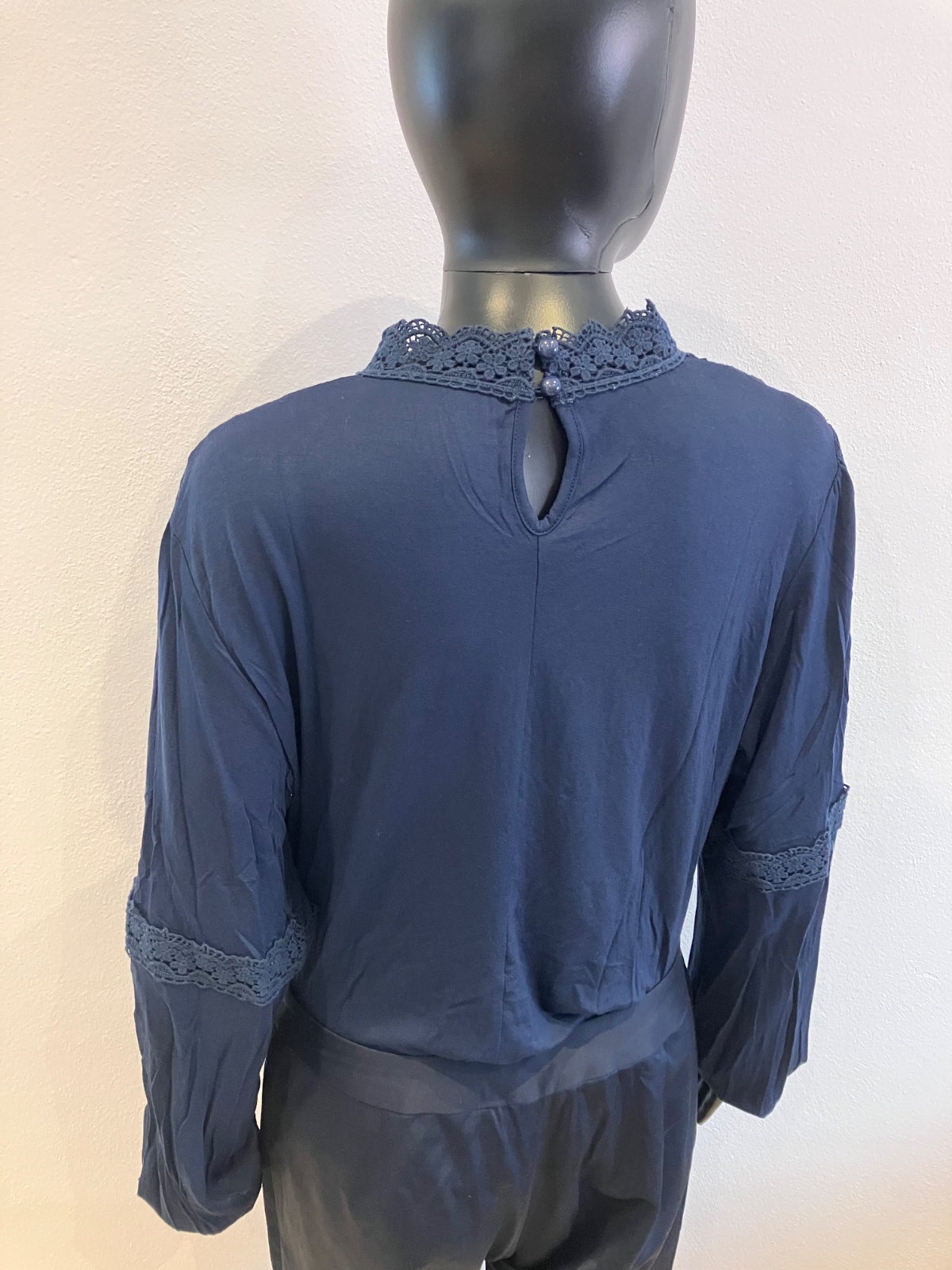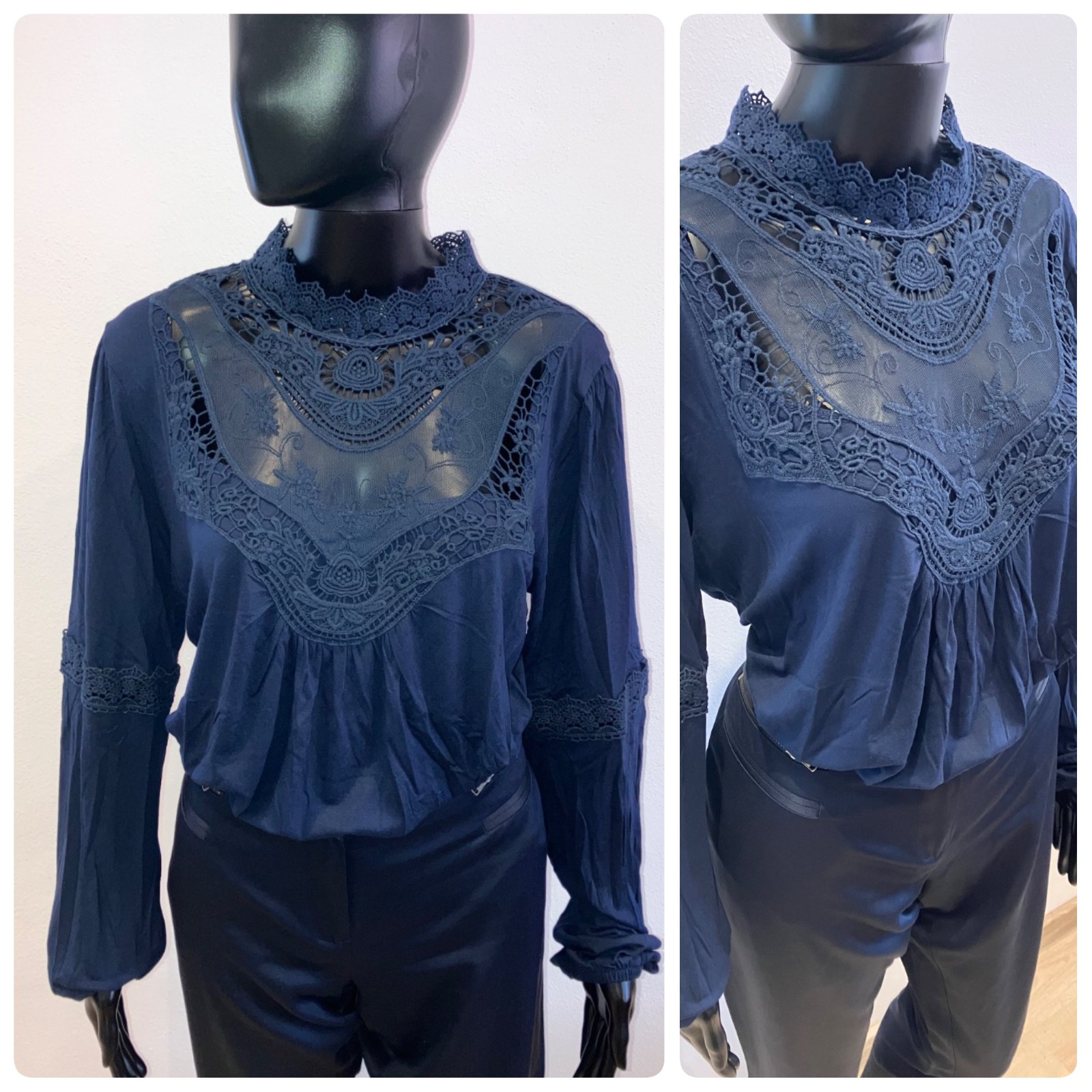 Dámske tmavomodré tričko s dlhým rukávom, čipkovaný výstrih so stojačikom, ukončenie rukáva na gumičku, elastické. Hodí sa k džínsom a podpätkom a sukni.