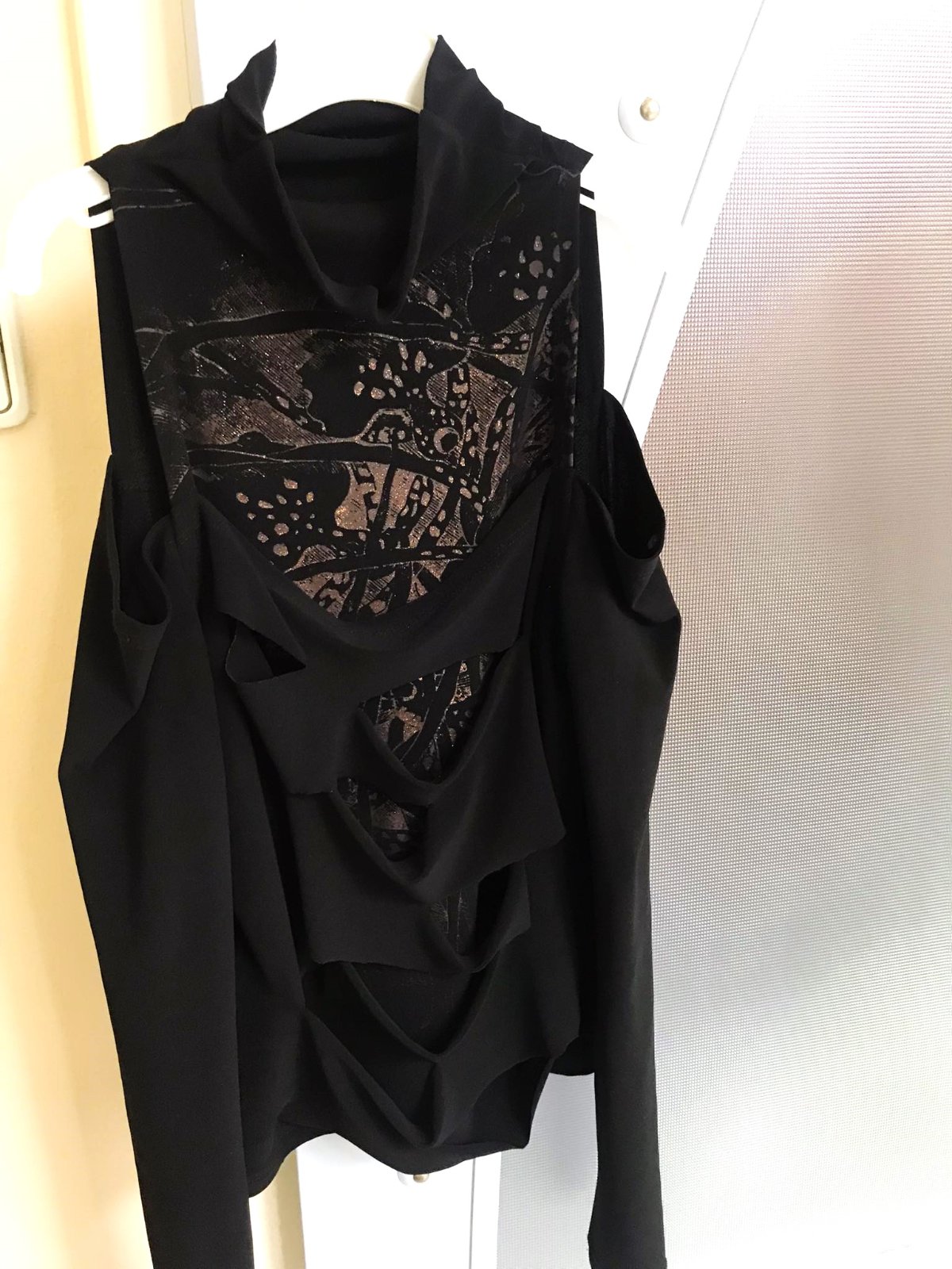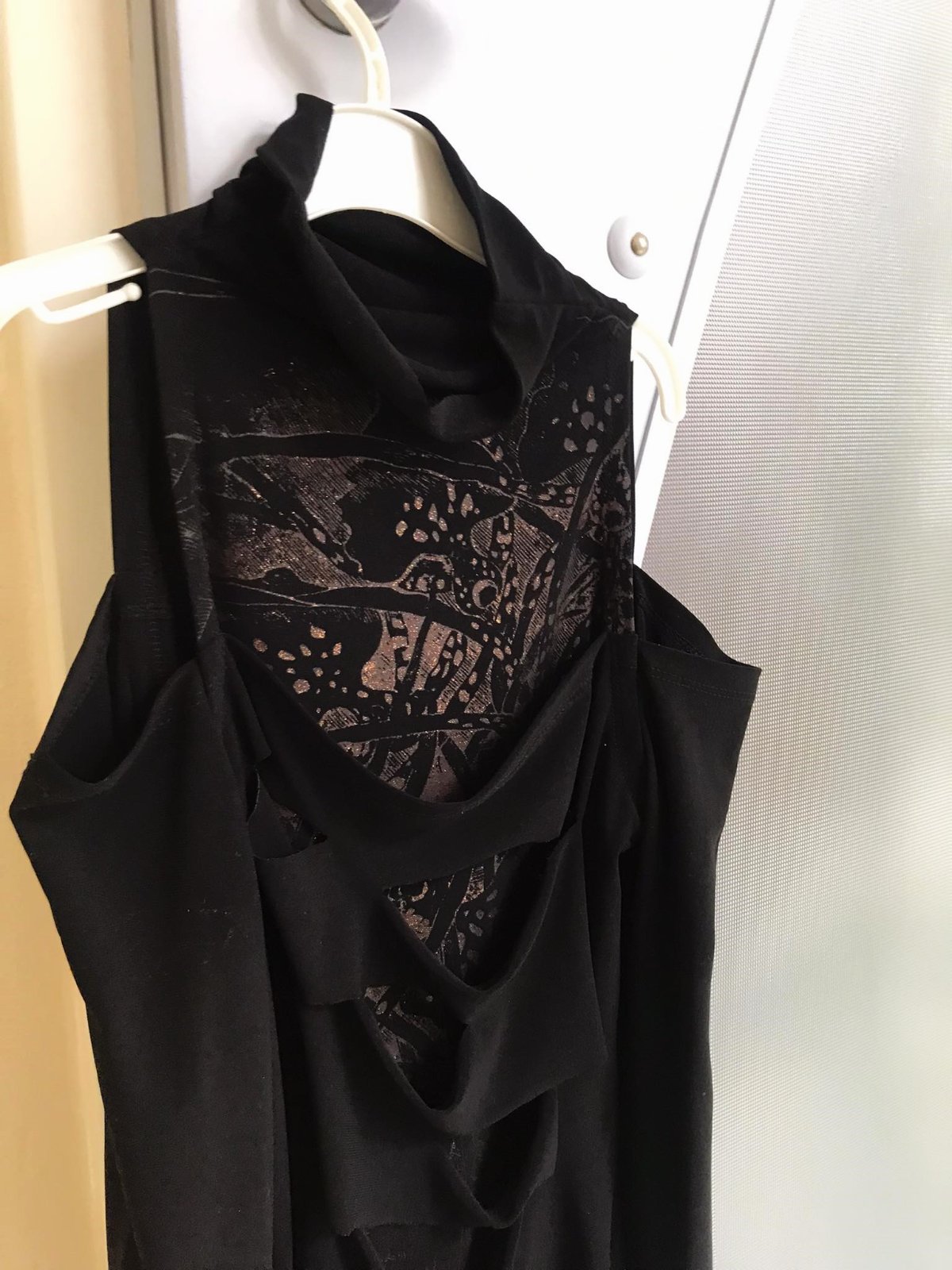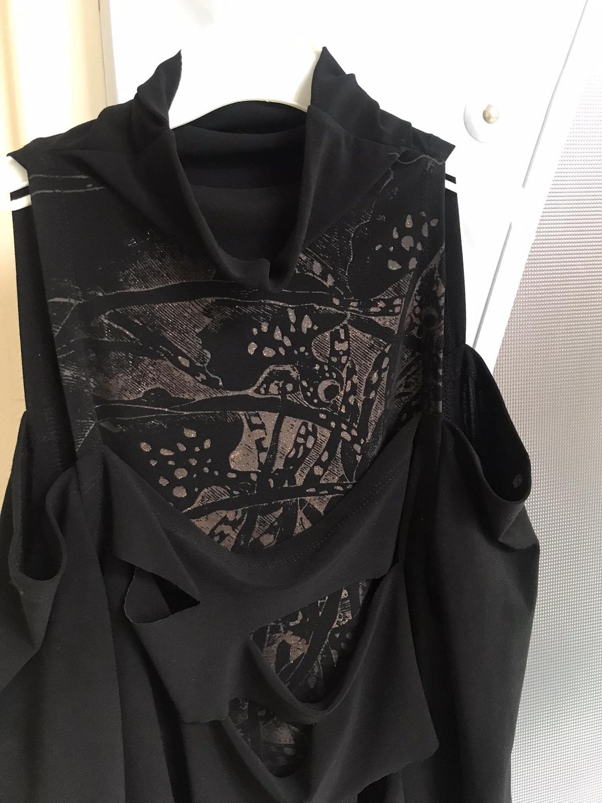 sýtočierne extravagantné zaujímavé tričko,oblečené na 1 príležitosť,vpredu duplované - vrchný diel poprestrihovaný,nafotené aj na svetlo,aby vynikli detaily,je elastické, ramená sú odhalené,stojačik volne padá a dá sa pekne aranžovať,krásny strih,výborná kvalita,super k nohaviciam,resp. sukni s vysokým pásom,vhodné aj na spoloč. podujatia