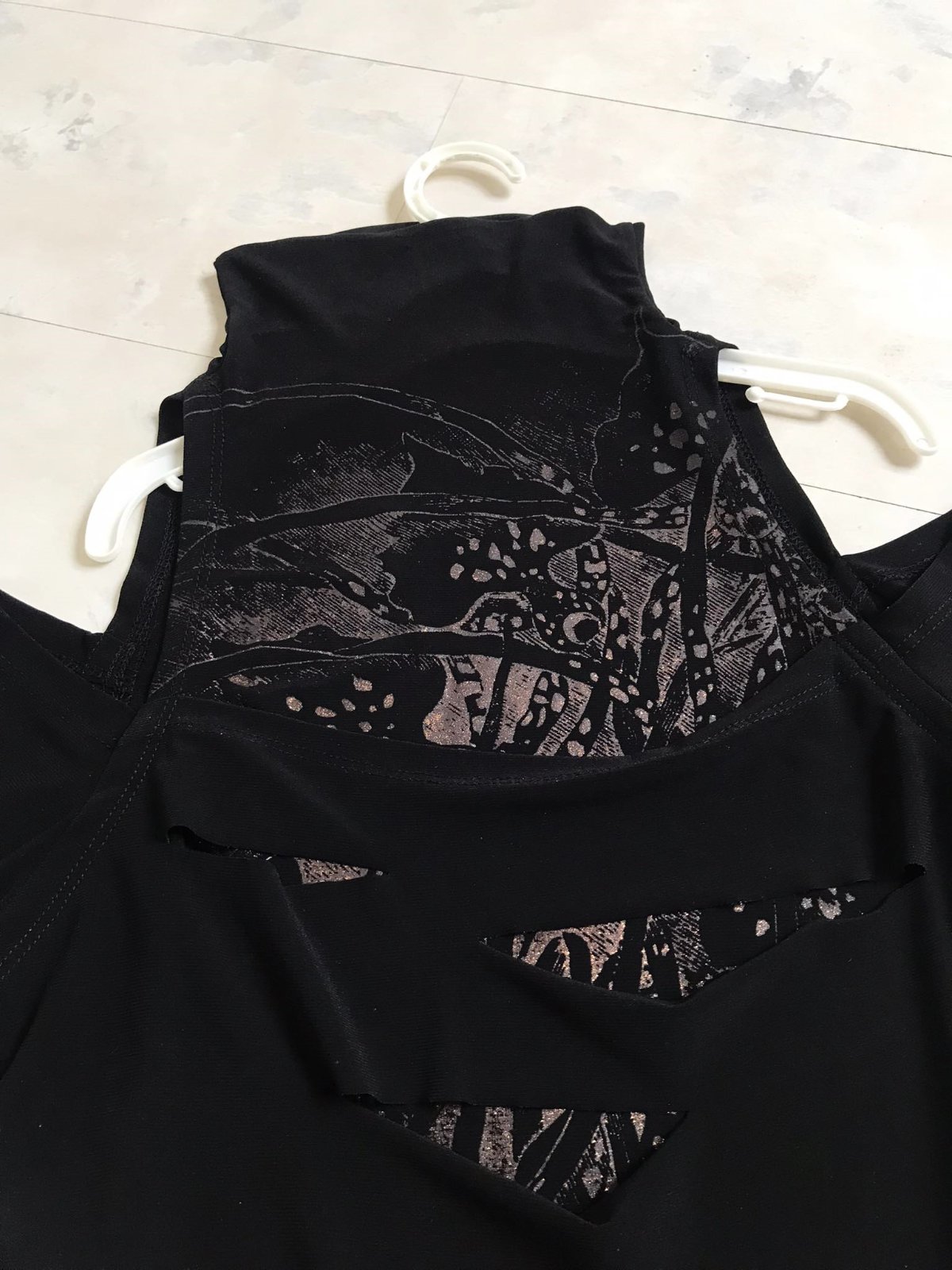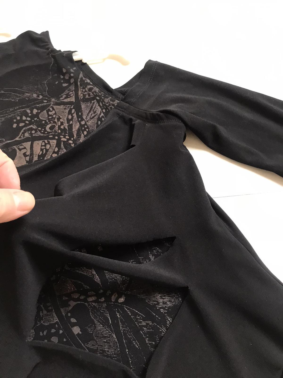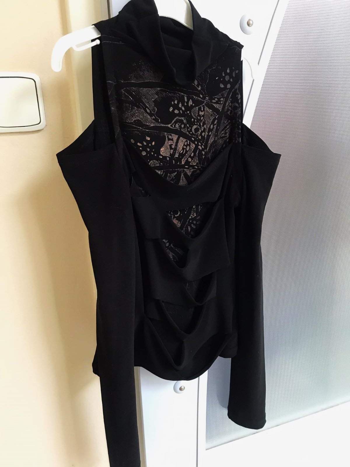 sýtočierne extravagantné zaujímavé tričko,oblečené na 1 príležitosť,vpredu duplované - vrchný diel poprestrihovaný,nafotené aj na svetlo,aby vynikli detaily,je elastické, ramená sú odhalené,stojačik volne padá a dá sa pekne aranžovať,krásny strih,výborná kvalita,super k nohaviciam,resp. sukni s vysokým pásom,vhodné aj na spoloč. podujatia