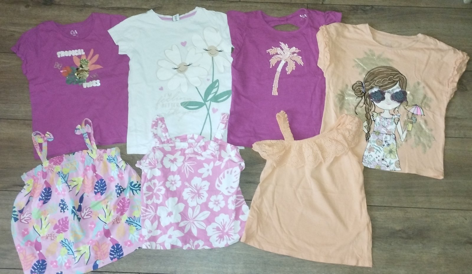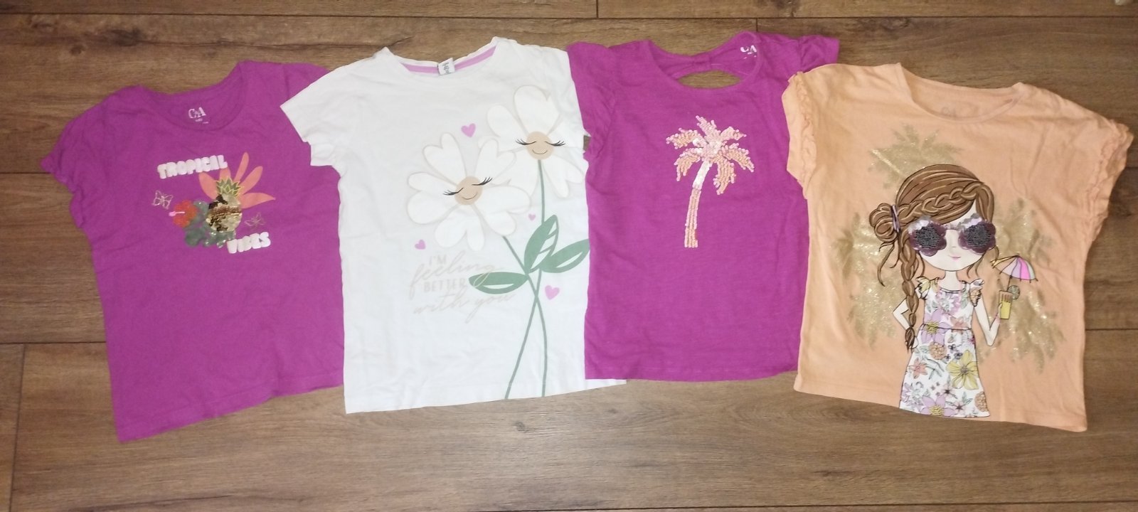 Krásne tričká bez fľakov a poškodení. Nosené pár krát. Veľkosť 110 ale značka C& A sú trochu menšie veľkosti. Kľudne na 194.