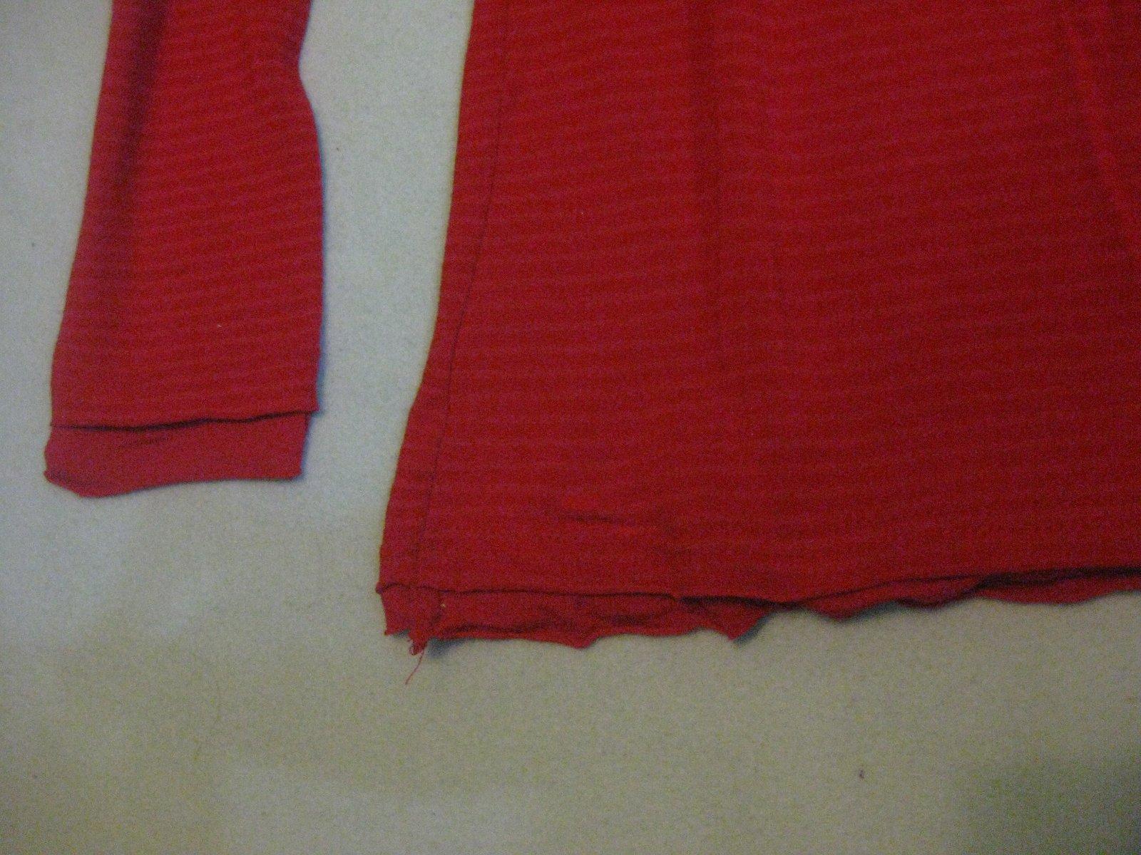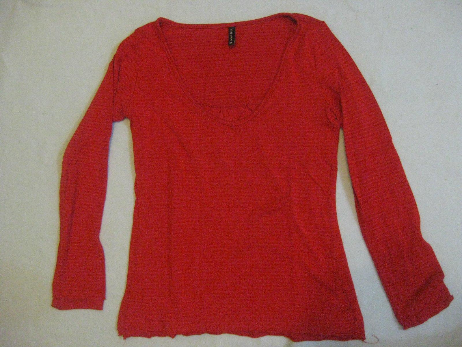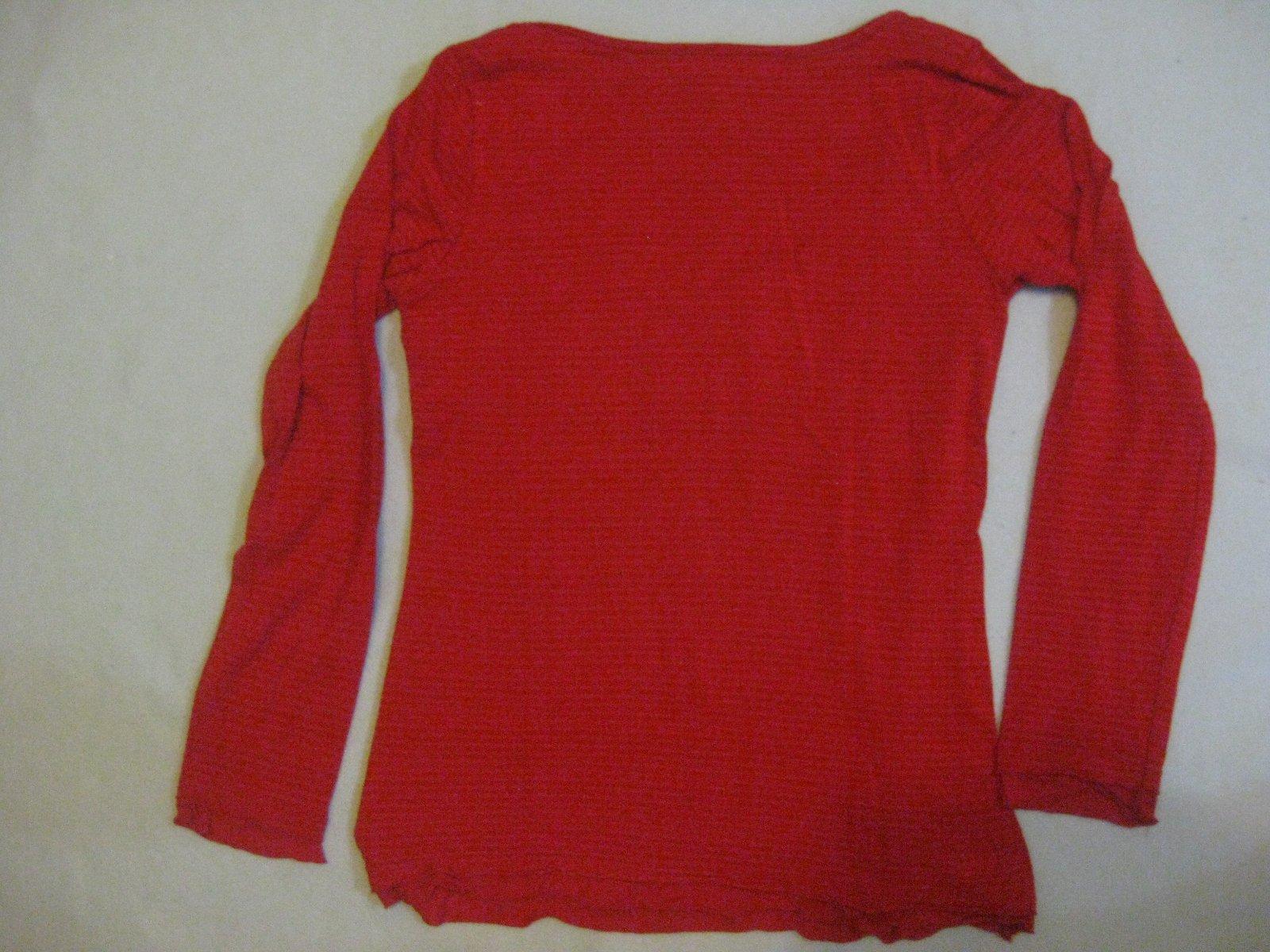 Cervene tenke pasiky, s podsitym efektom na rukavoch, spodku a na vystrihu. Velmi dobry stav.