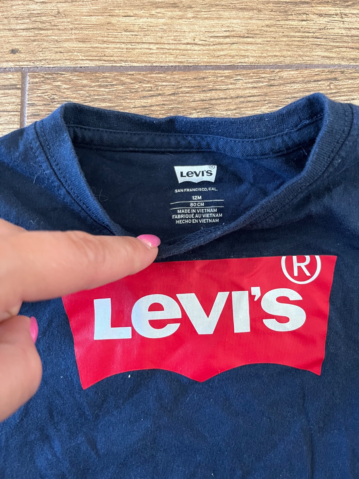ekné tričko s dvomi limčekmi a zapínaním pod krkom na dva gombíčky. Rukávky sú tmavo modré s patentami. V predu nášivka Levis. Velkosť udávaná 12M.