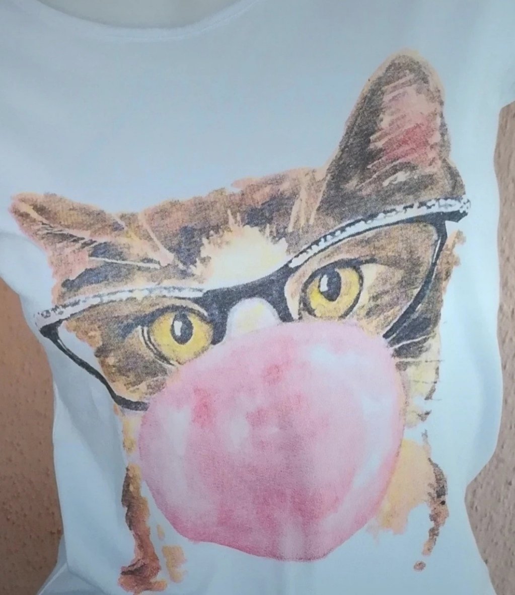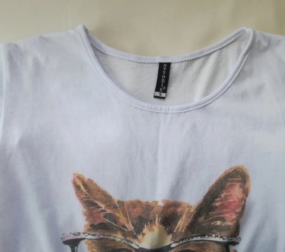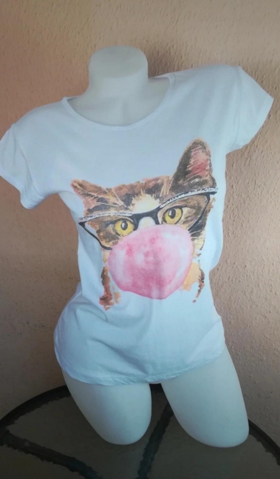 Nenosené, nové, jemnučké biele dámske bavlnené tričko s aplikáciou: mačka.