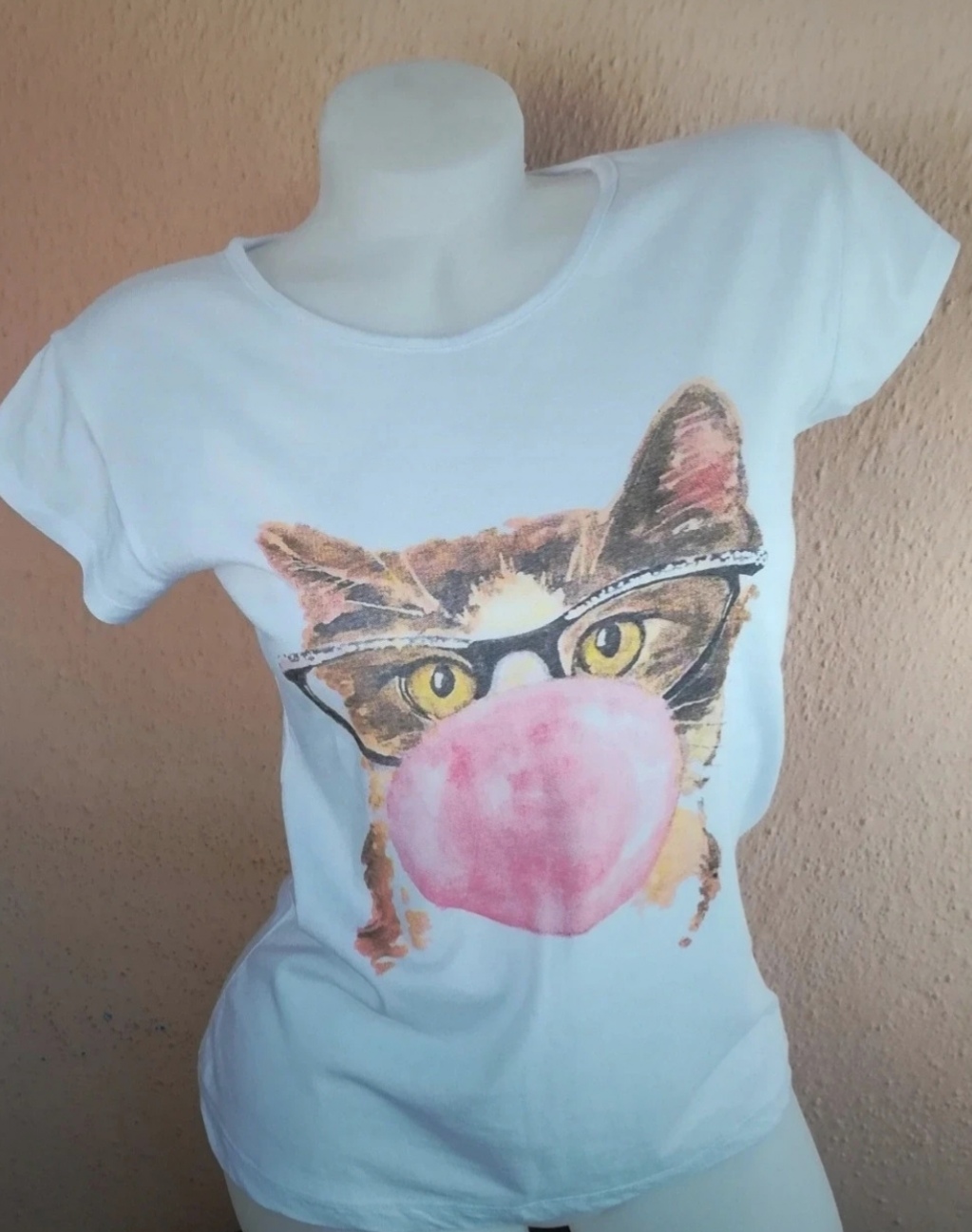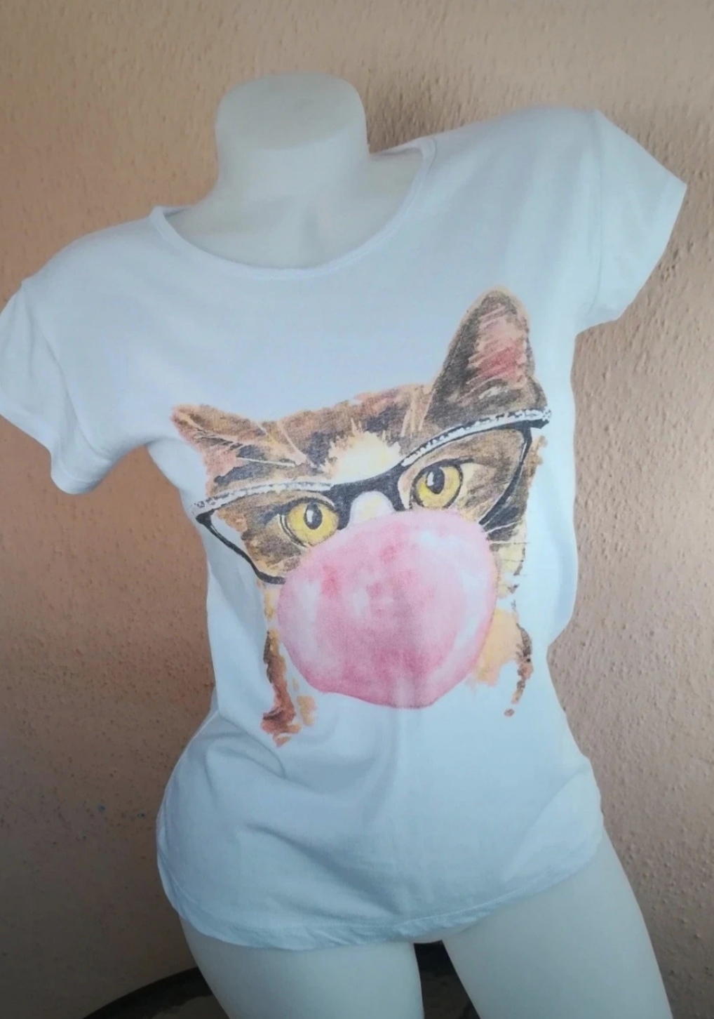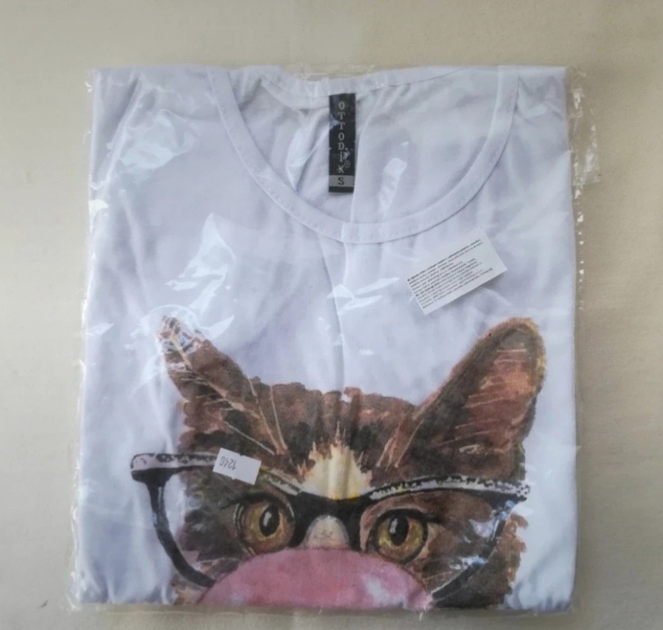 Nenosené, nové, jemnučké biele dámske bavlnené tričko s aplikáciou: mačka.