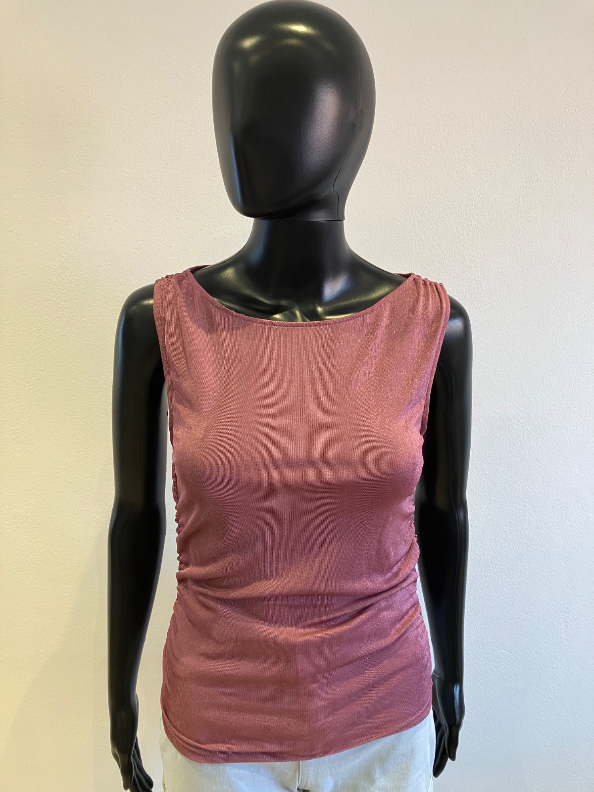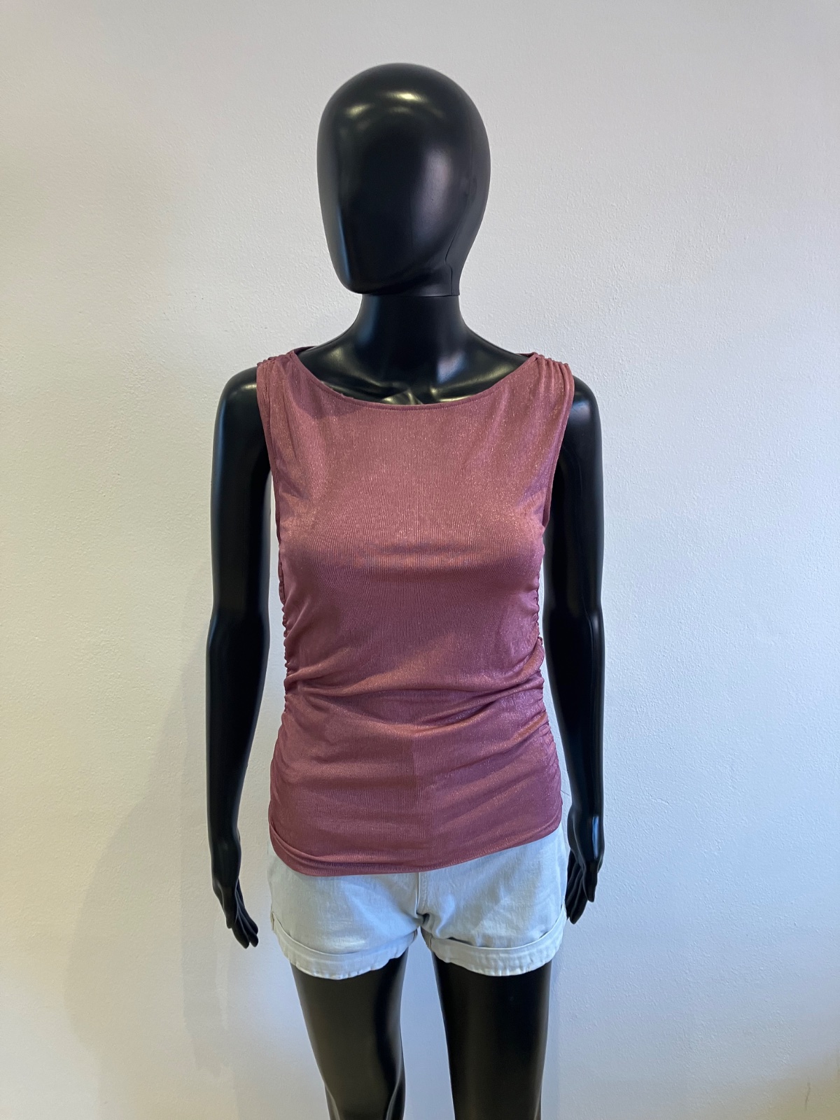 Dámske lesklé tričko bez rukávov, nazberkané na bokoch, tenké, elastické, farba ružová, materiál 95%polyester 5%elastan.