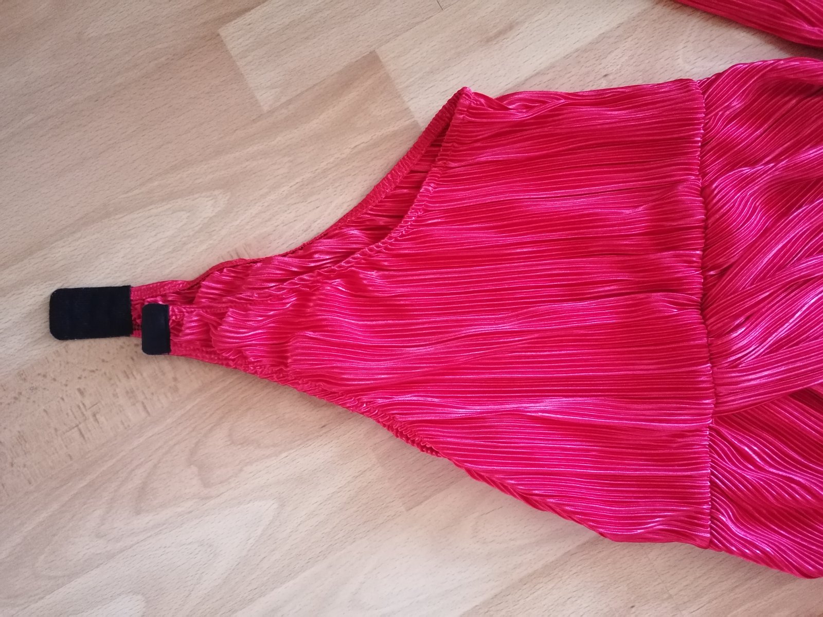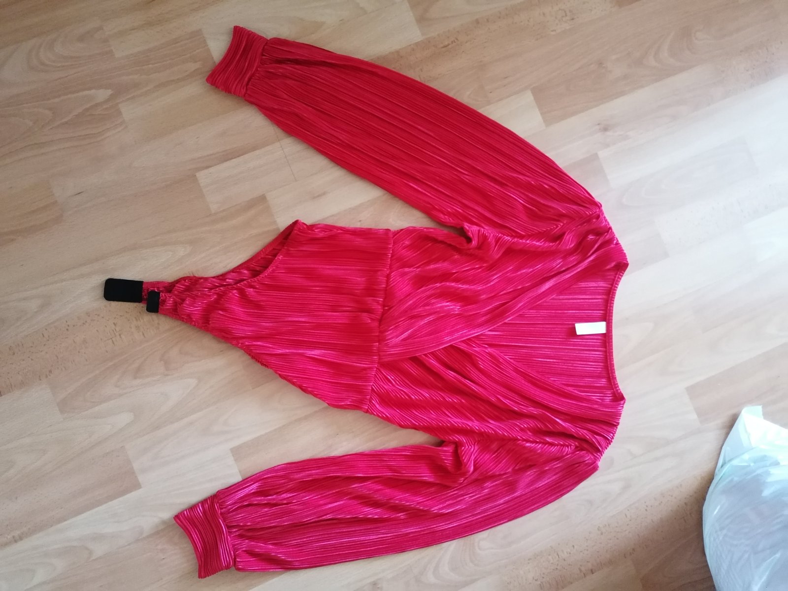 Klasická červená farba, nie kriklava, vrubkovaný materiál, oblečené 2x,maximalne elastické takže vojde aj L