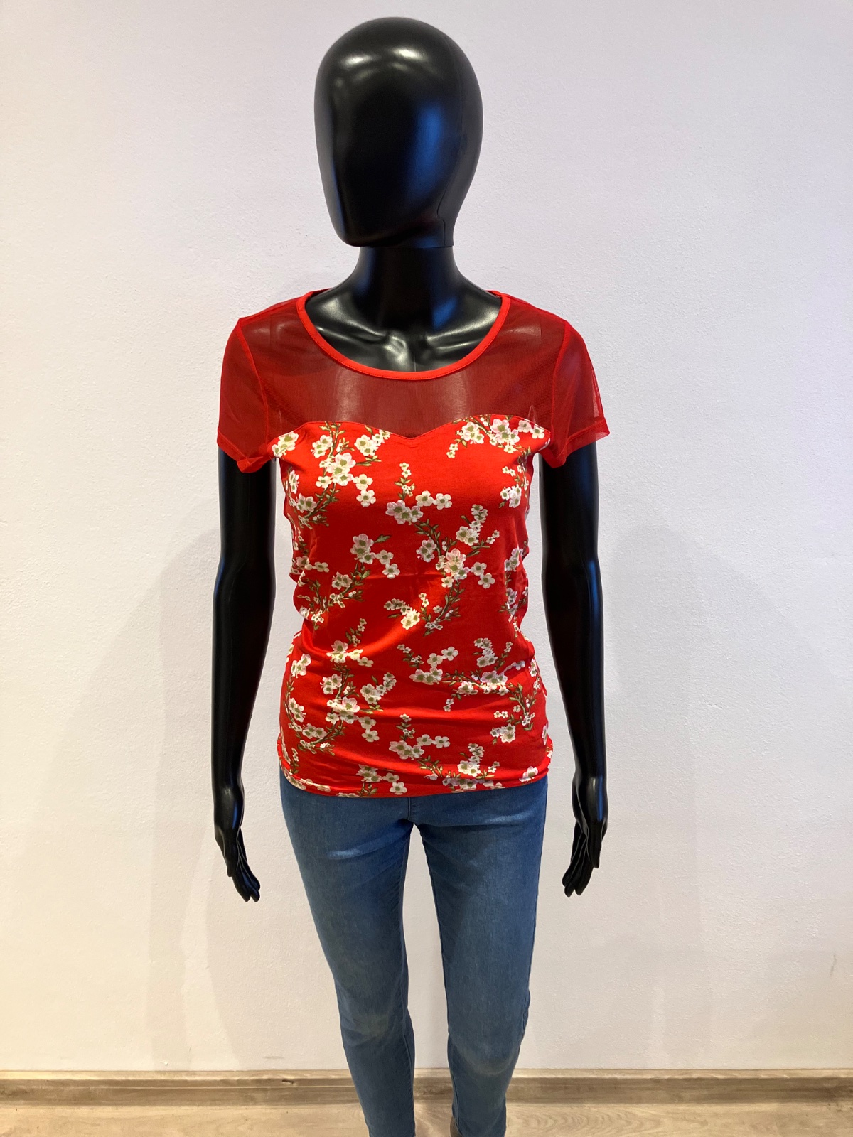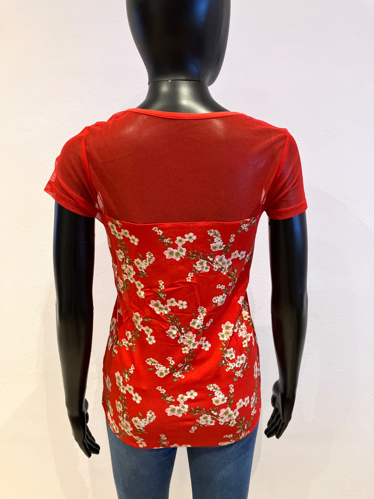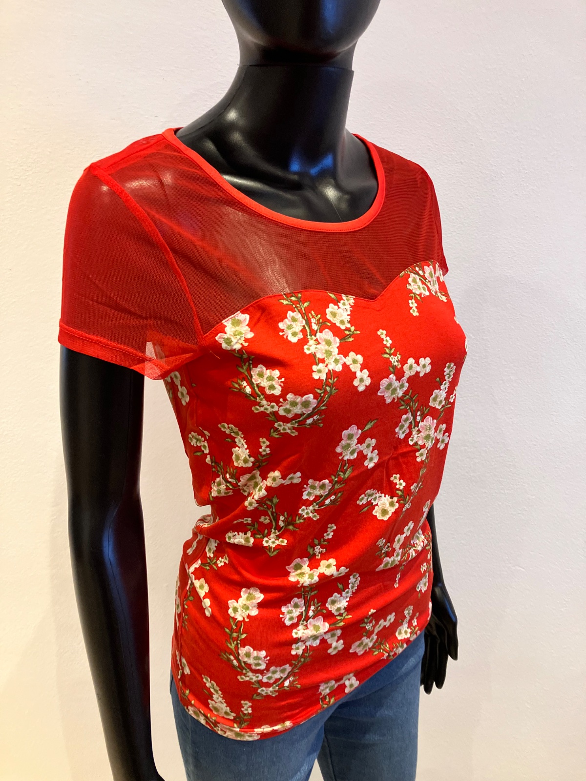 Dámske tričko s krátkym rukávom a tylom, elastické, materiál: 95%viskóza,5%elastan.