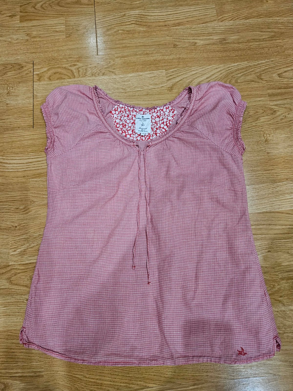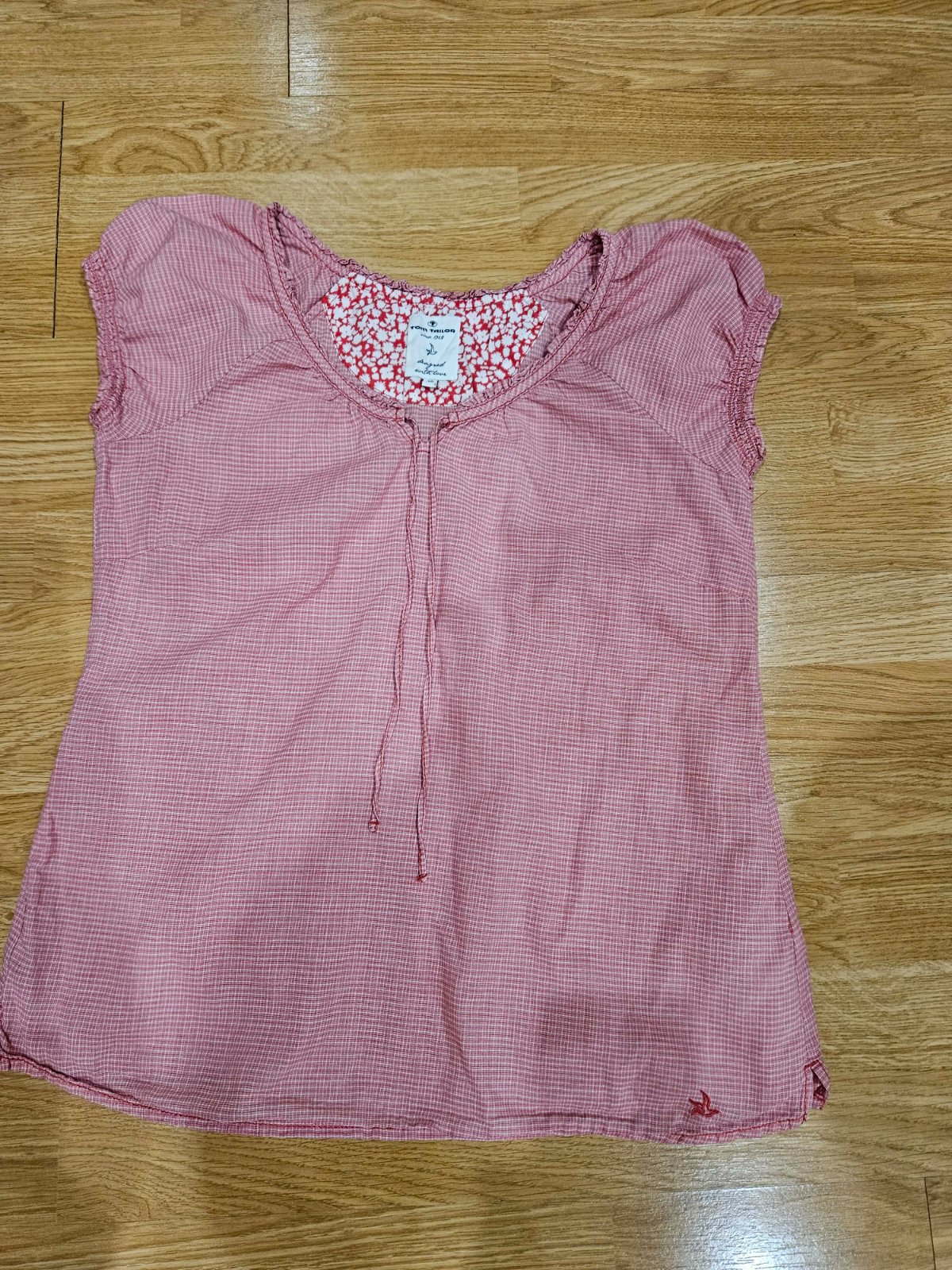 pekné tričko bez známok nosenia, v rukávoch je jemná gumka, netlačí. Vo výstrihu je šnúrka, ktorou si môžete stiahnuť, ale aj nechať takto ako je teraz. Šírka popod paže je 49 x 2 cm.