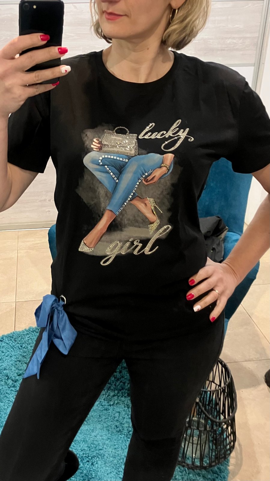 Pohodlné dámske tričko s krátkym rukávom,potlačou,zdobené s kamienkami. Na spodku s mašličkou. Elastické. Materiál:95%bavlna,5%elastan. Veľkosť L/XL. Krajina pôvodu: P.R.C.
