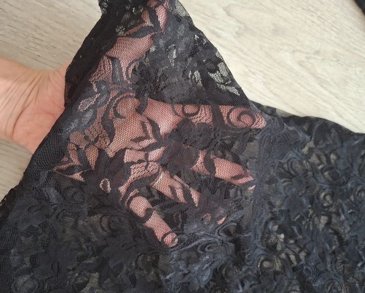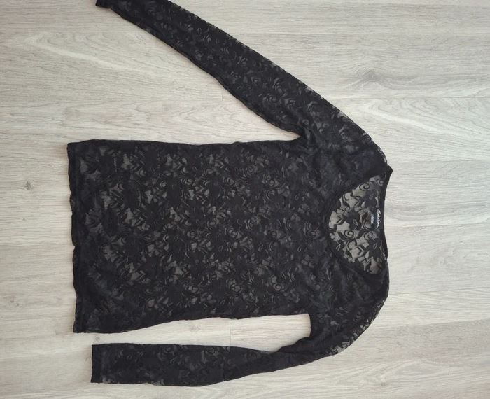 Pár krát oblečené, zachovalý stav bez poškodení. Čierne čipkové tričko s dlhým rukávom, priesvitné, vhodné ako vrchná vrstva na tielko. Veľkosť je písaná M, ale sedí skôr na S, keďže je dosť úzke.
