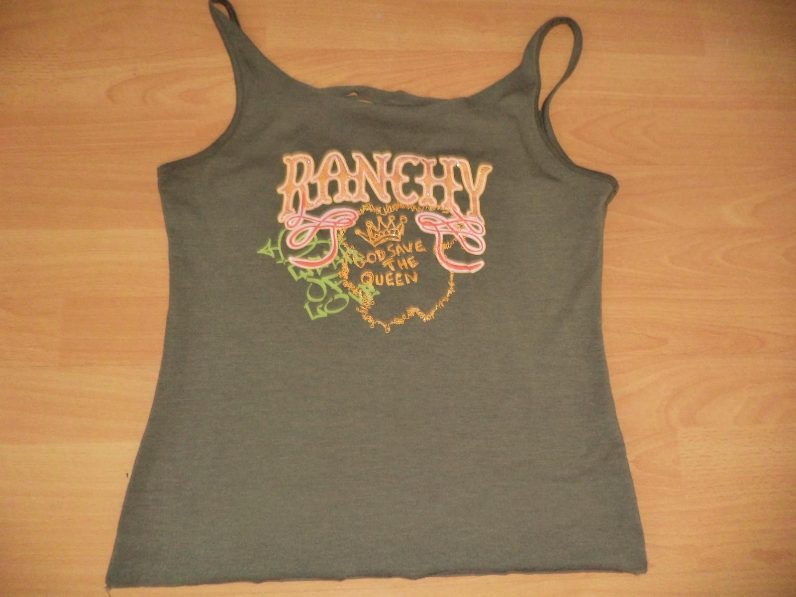 Predam pekne damske tielko s napisom v predu a v zadnej časti poprestrihane nosene je pisane XXL ale velkosť zodpoveda L ,dlžka 58cm, obvod hrude 86cm je elasticke