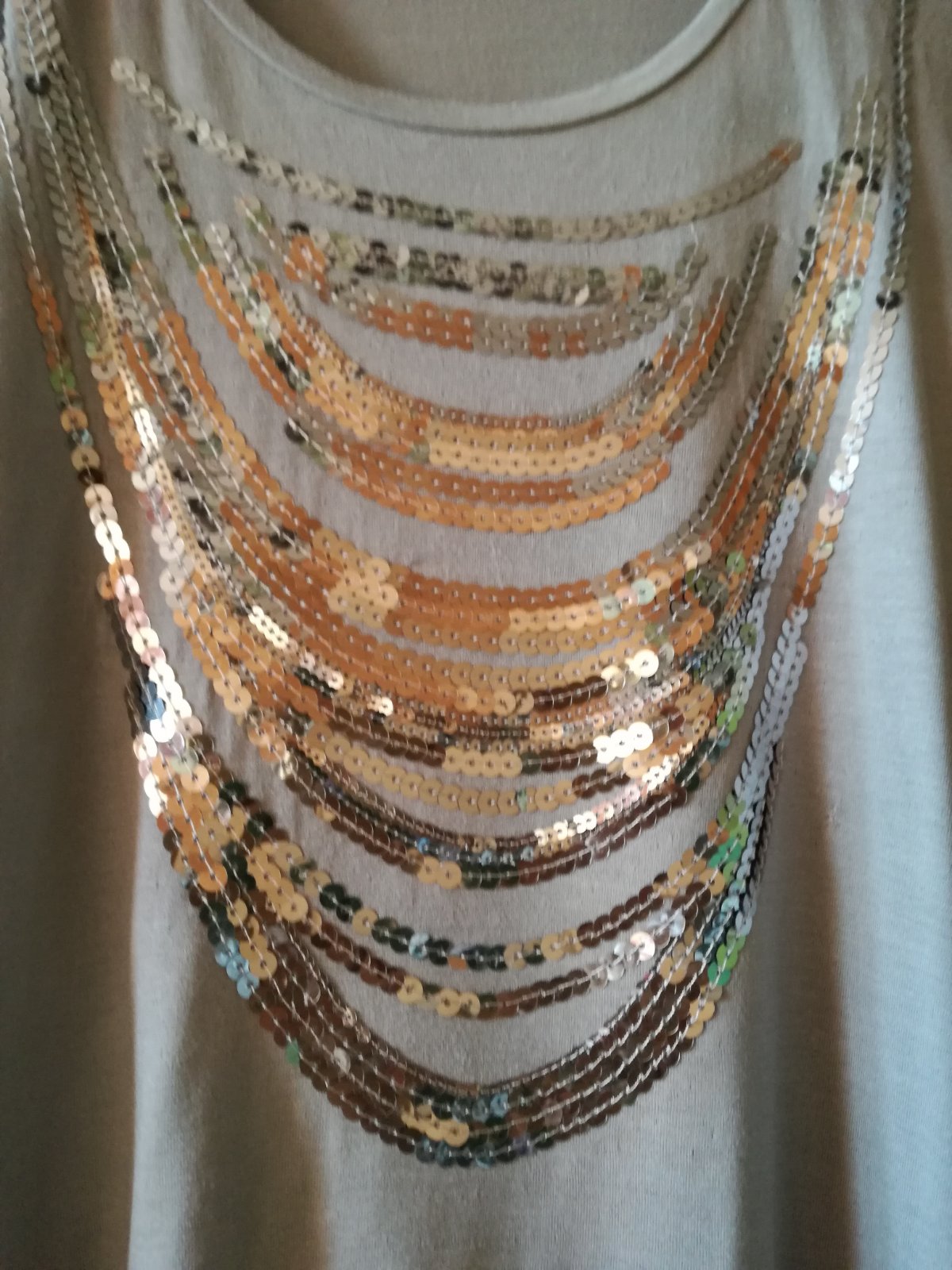 Pekné tričko, s krásnou aplikáciou na prsiach a predĺženým zadným dielom.