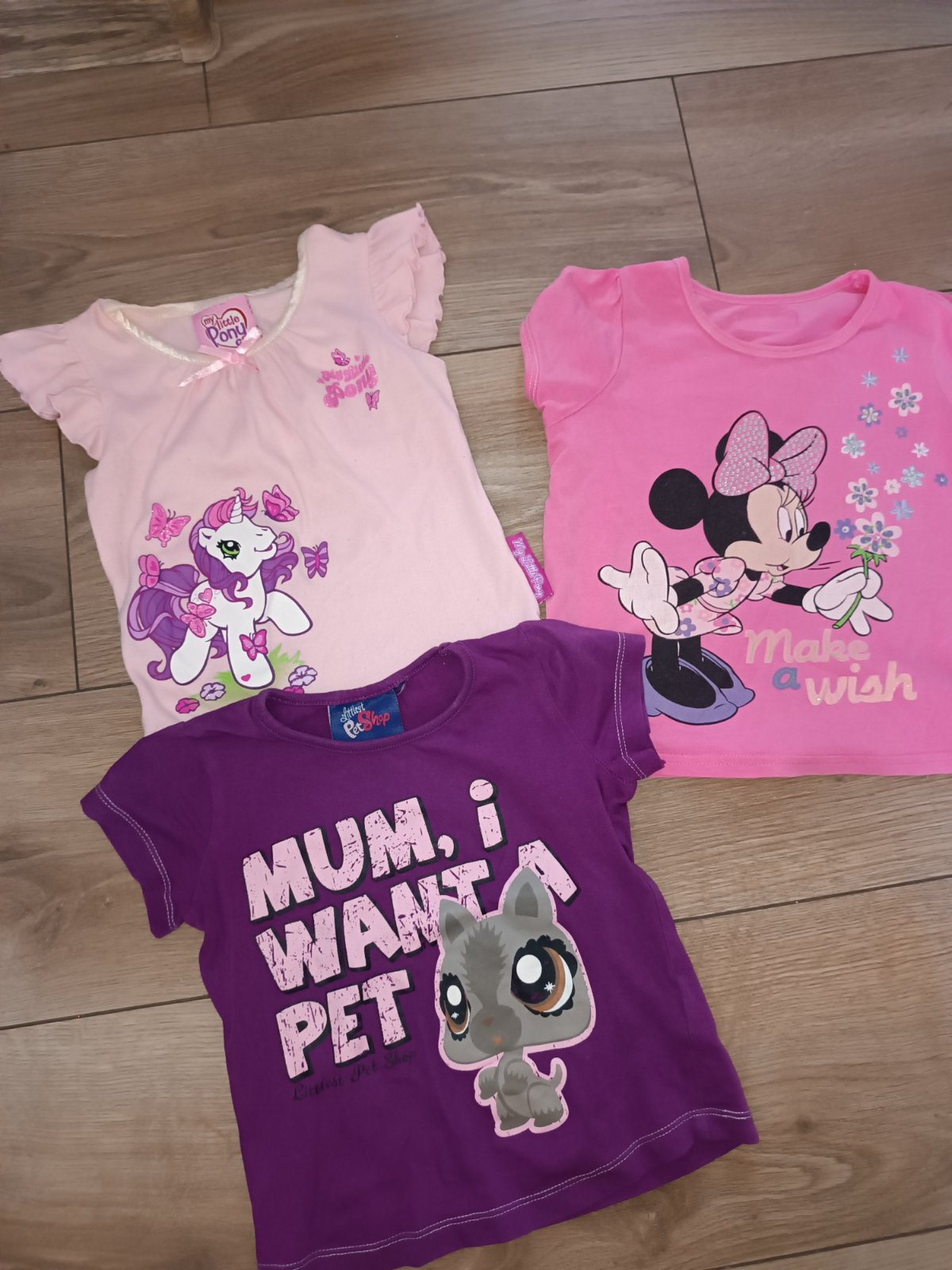 Predám tričká, veľkosť 98, ale sedia na 92. Rada pomeriam v prípade záujmu. Predám aj zvlášť po 3e.