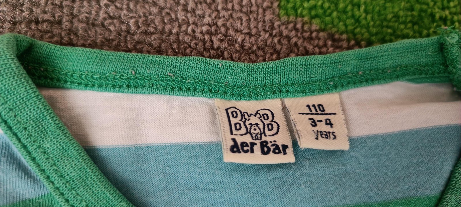 Pásikové zeleno-modro-biele s bagrom, bežné známky nosenia, pekný stav, veľ. 110, BOB Der Bär:
