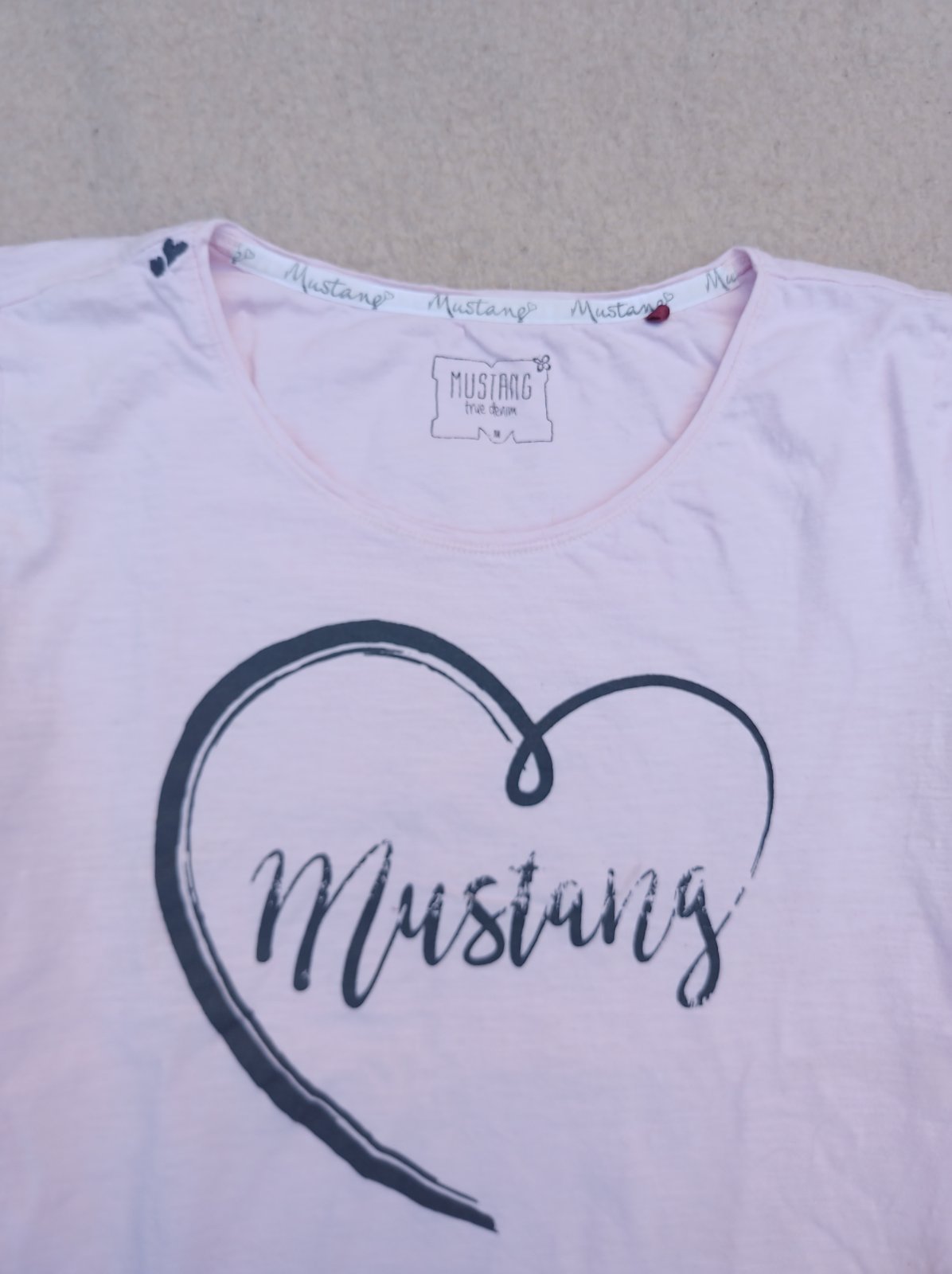 Nosené v dobrom stave, príjemný materiál na telo. Vpredu logo Mustang, veľkosť udaná M, vpredu také tmavšie miesta viď foto. Špp 43cmx2 a dĺžka 59cm