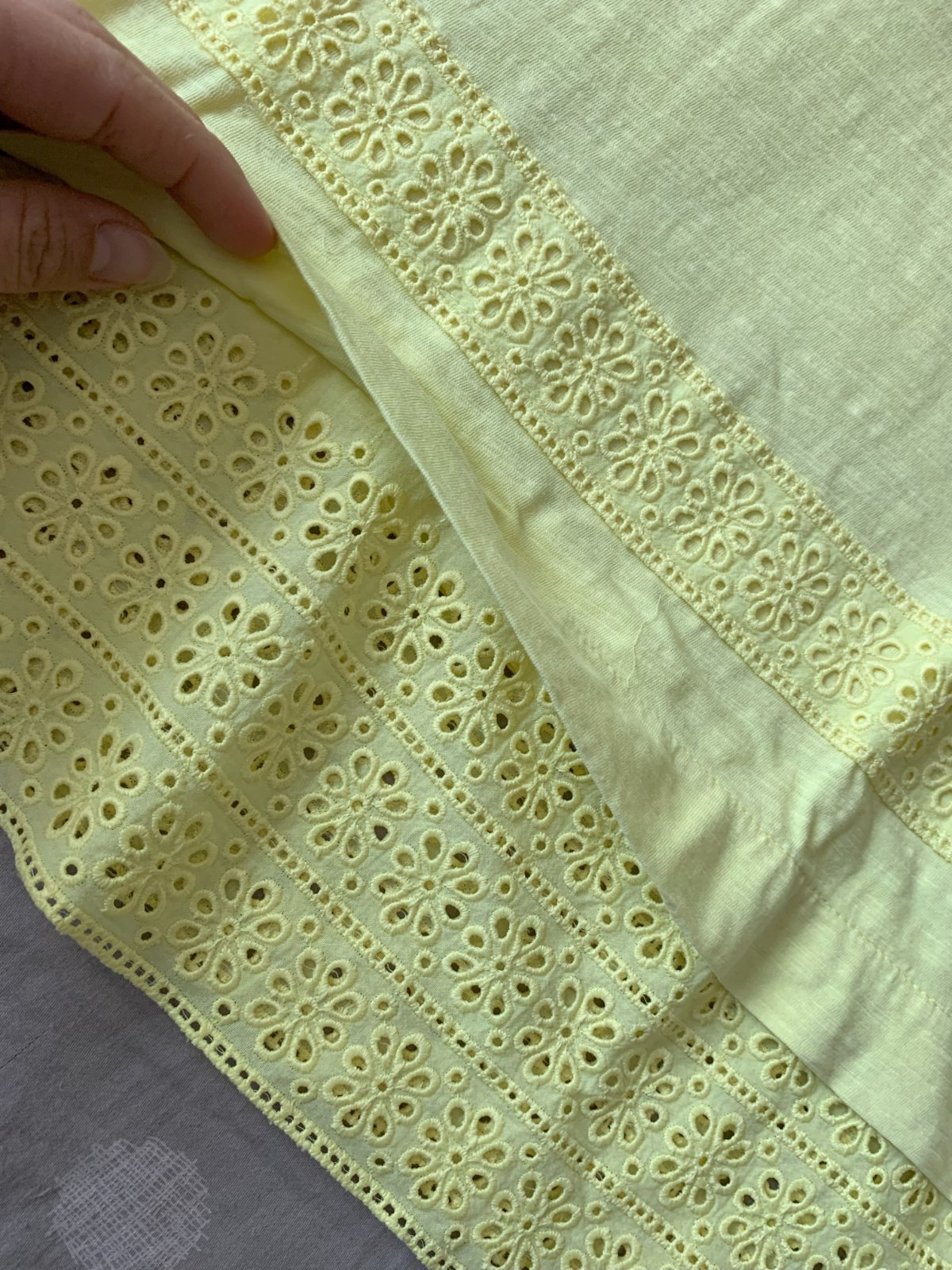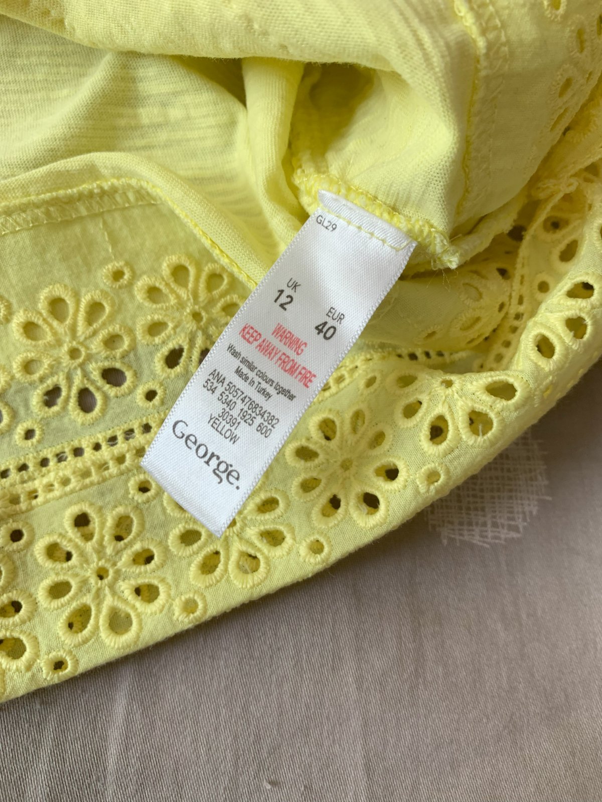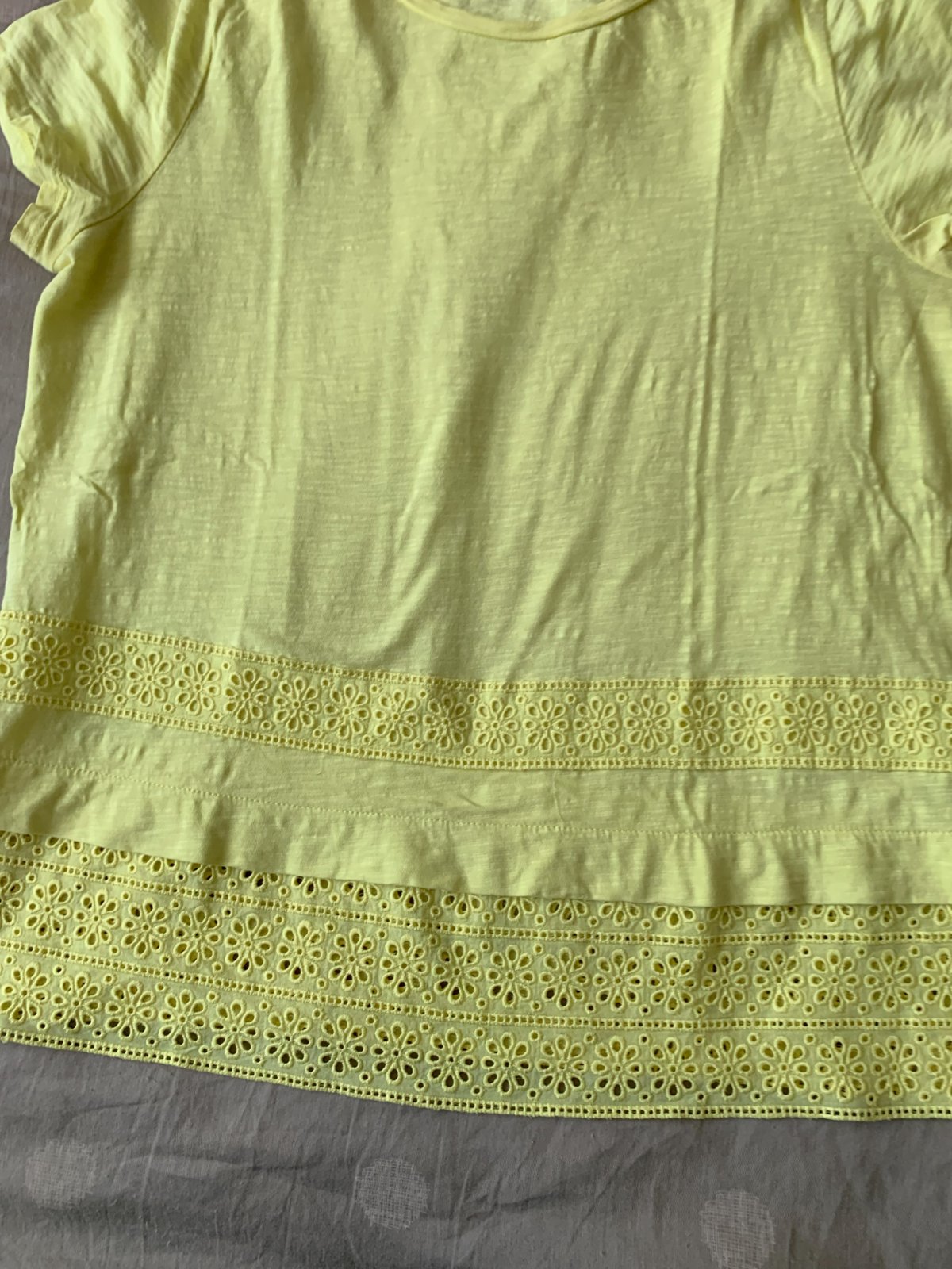 Tričko sviežej žltej farby s "vyrezávaným" kvietkovaným vzorom (emroidery). Veľmi dobrý stav bez poškodení.