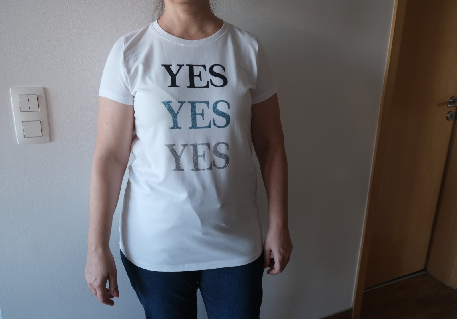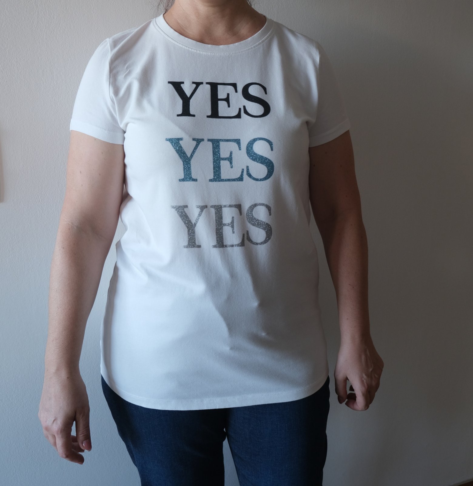 Popis tovaru: bledomodré bavlnené tričko s lesklým modrým nápisom yes