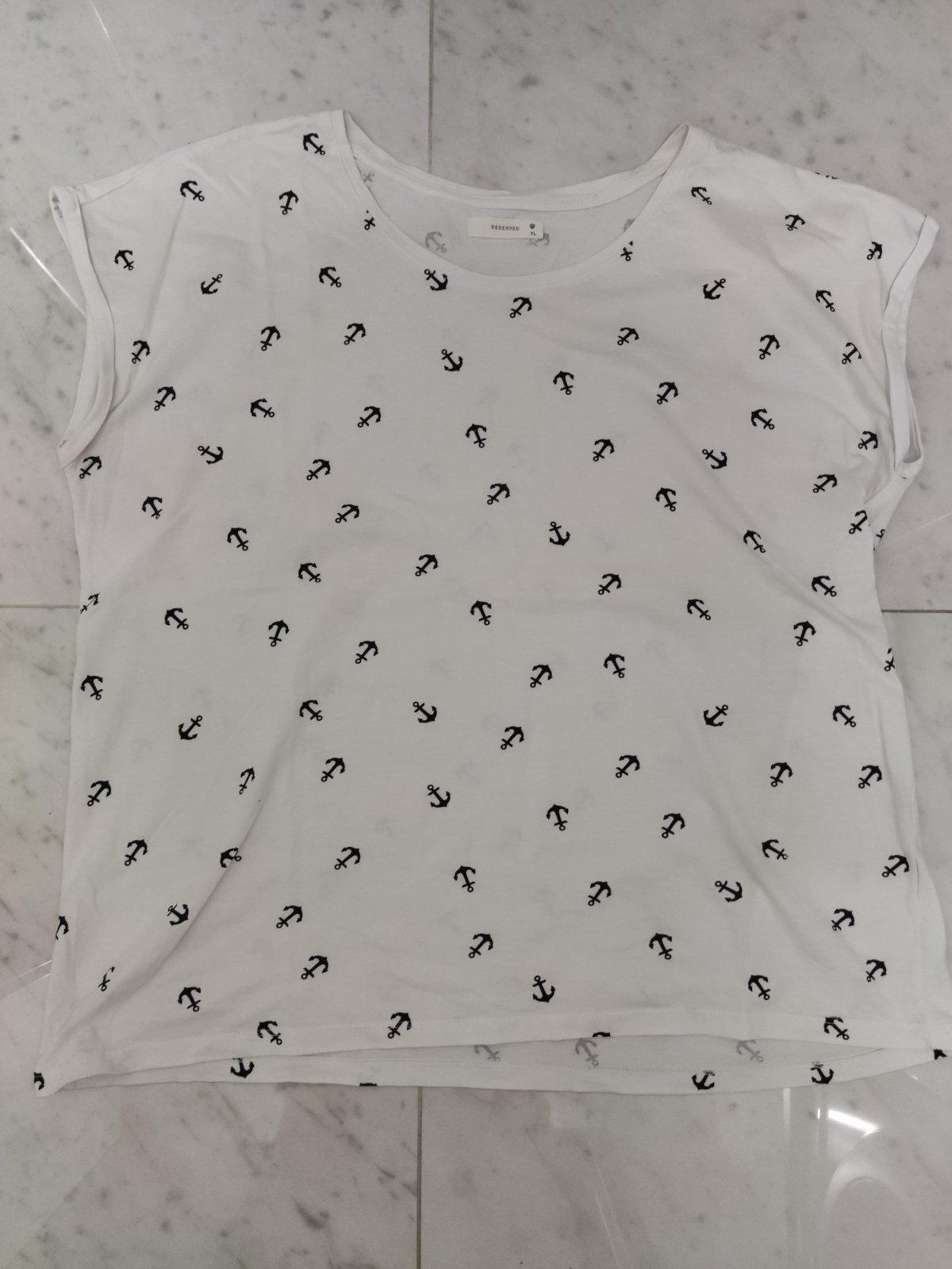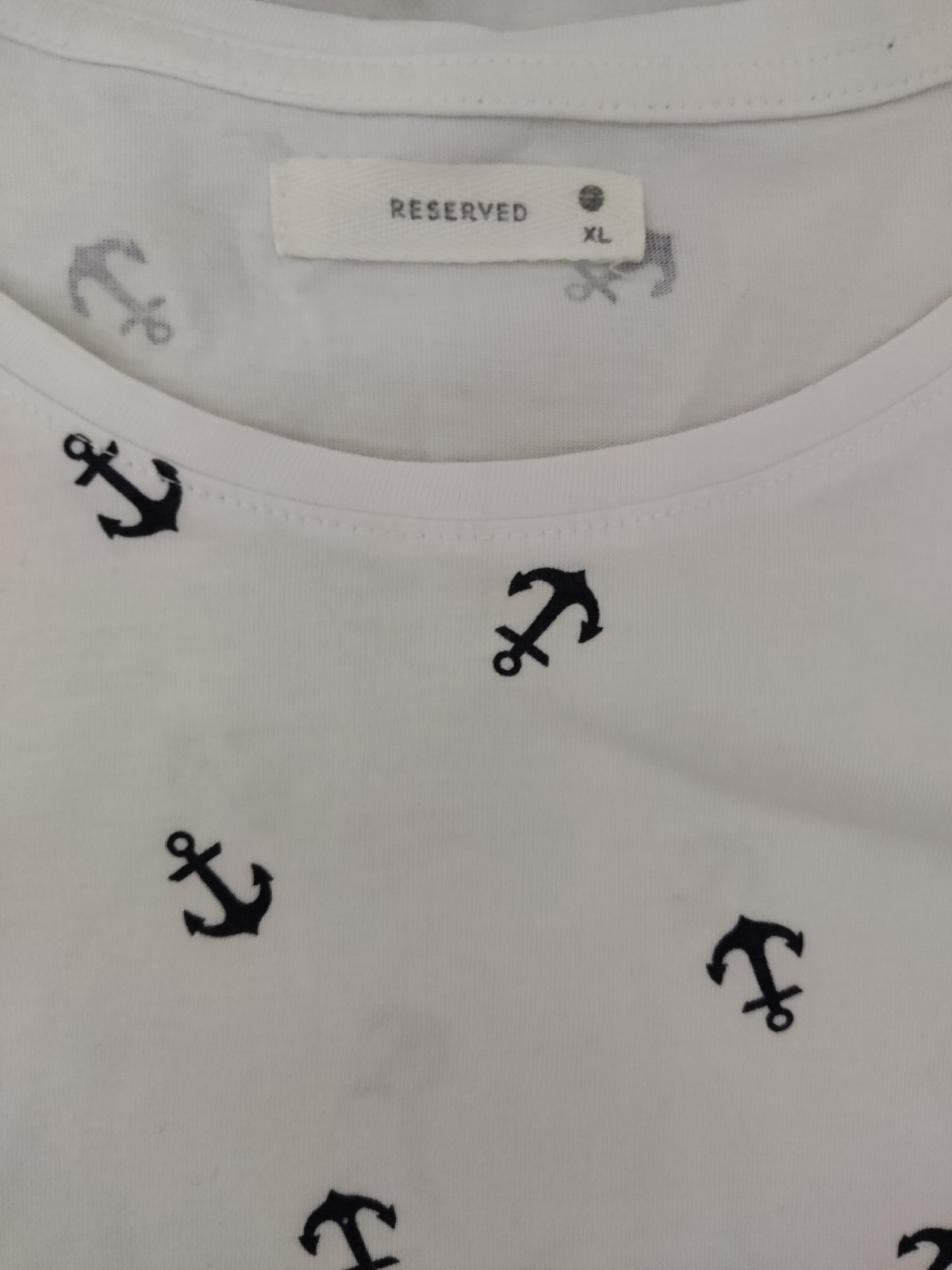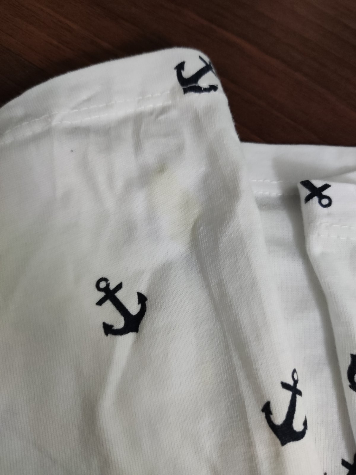 Bavlnené tričko s ⚓, dole mini fliacik, neskúšala som odstrániť (viď. foto)