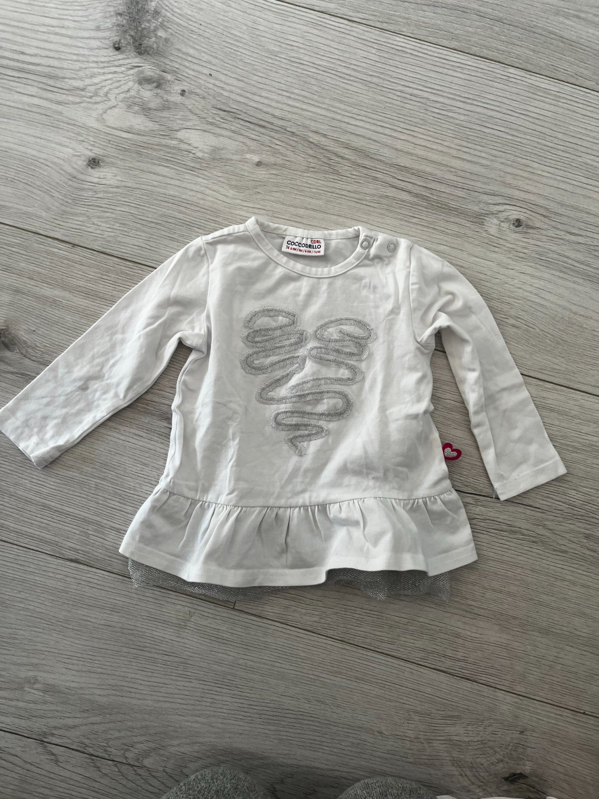 Predám biely dlhorukávový top so strieborným vzorom a volánom v spodnej časti značky Coccodrillo, veľkosť: 74 (6 - 9 mesiacov).