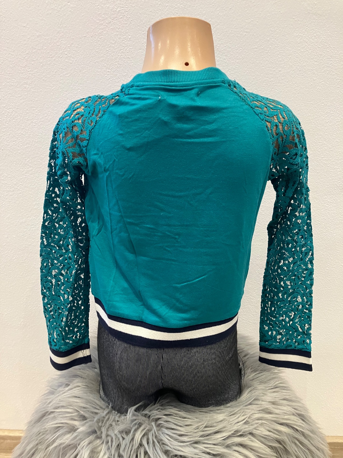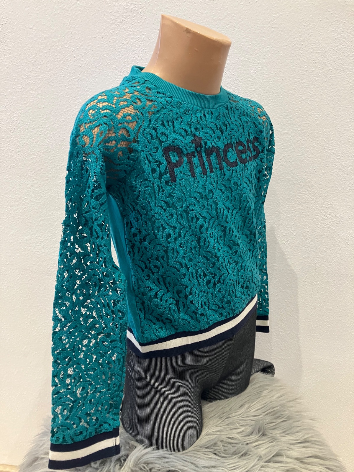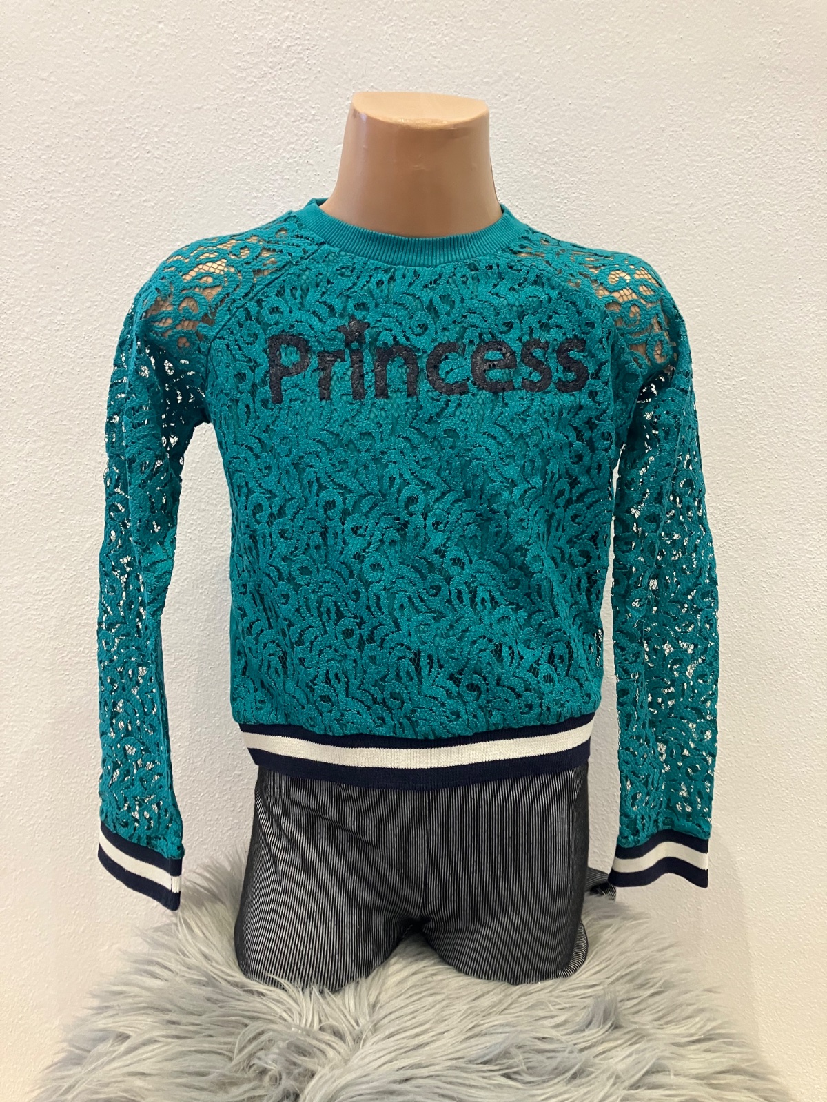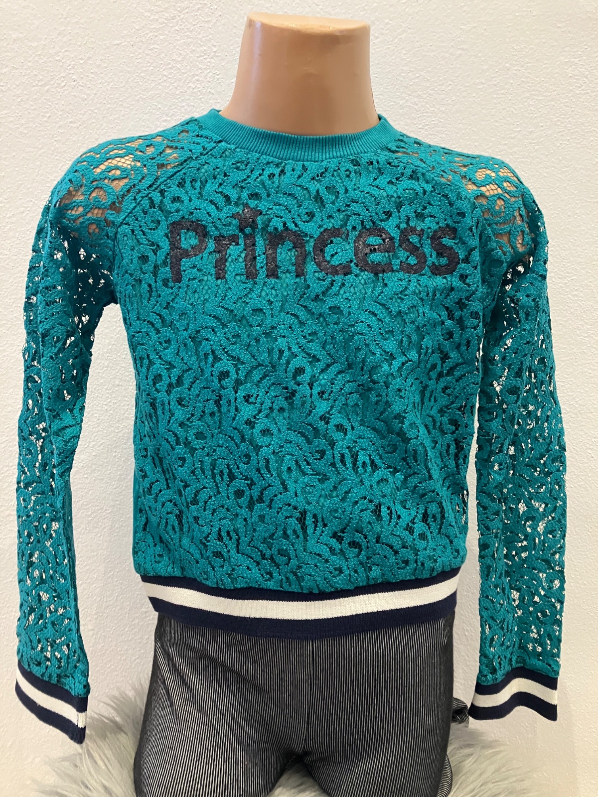 Dievčenské čipkované tričko, dlhý rukáv, s nápisom Princess, okrúhly výstrih, patent na rukávoch, v páse a okolo krku. Materiál: 50% bavlna,30% viskóza,18% polyester,2% elastan.