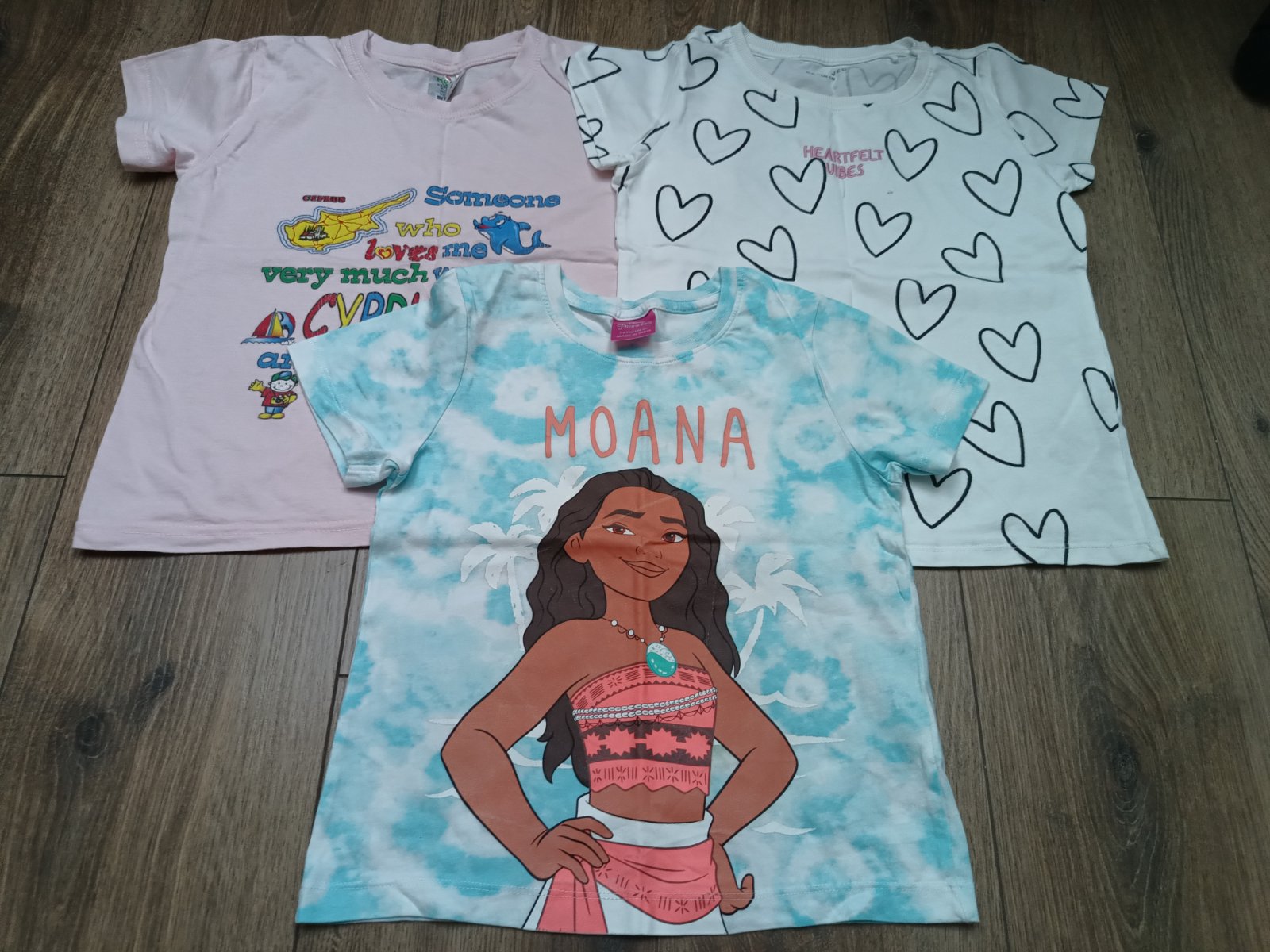 Pekný nosený stav, na bielom je malá dierka, cena spolu 2€, veľkosť 122/128.