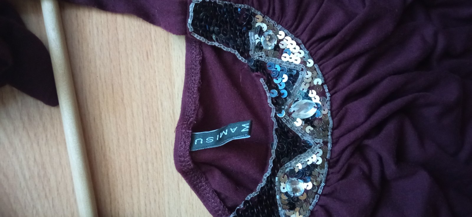 Pekné tričko, predný diel je celý vyšitý flitrami farby príbuznej tričku. Zn. AMISU Rozmery-tričko je pružné, merané v kľude Šírka pliec. 27 x 2cm Šírka pod pazuchou 38,5 x2 cm Šírka dole 47 x2 c...