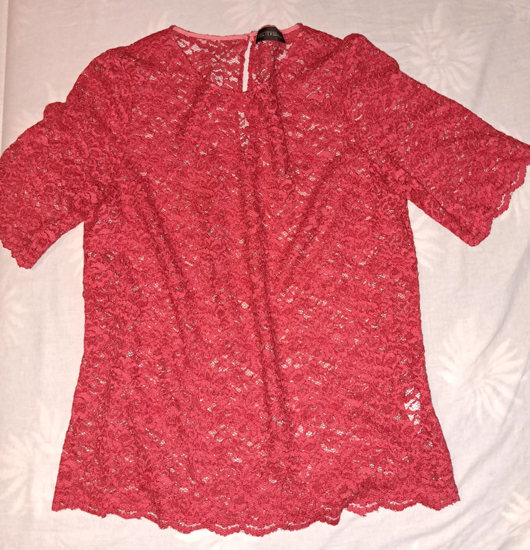 v dobrom nosenom stave velkost pisana L ale podla mna je to S dlzka 49 cm sirka 38 cm aplikacia je ciastocne popraskana vid. foto a na bruchu je malinky fliacik co pri noseni velmi nevidiet