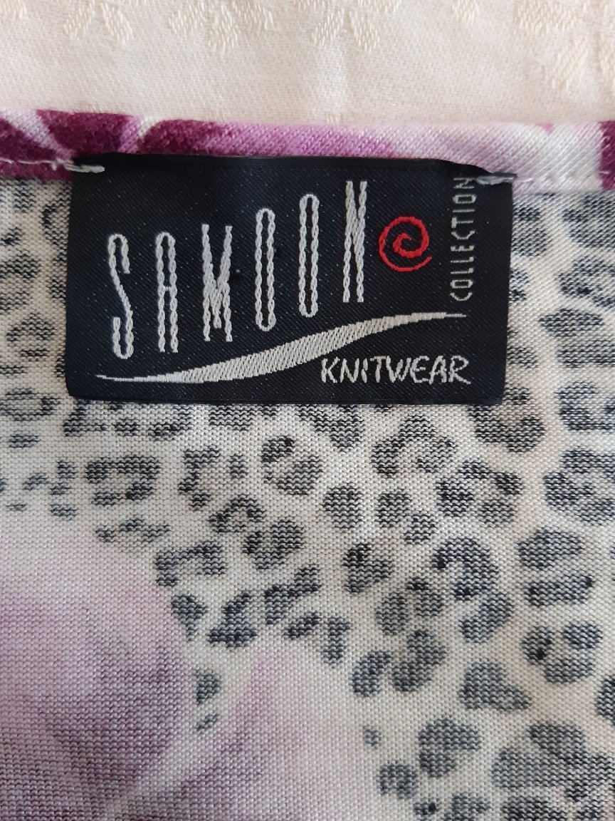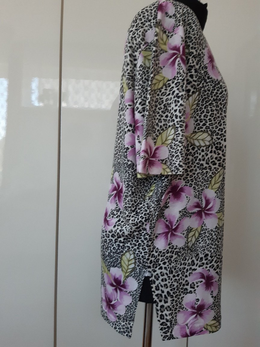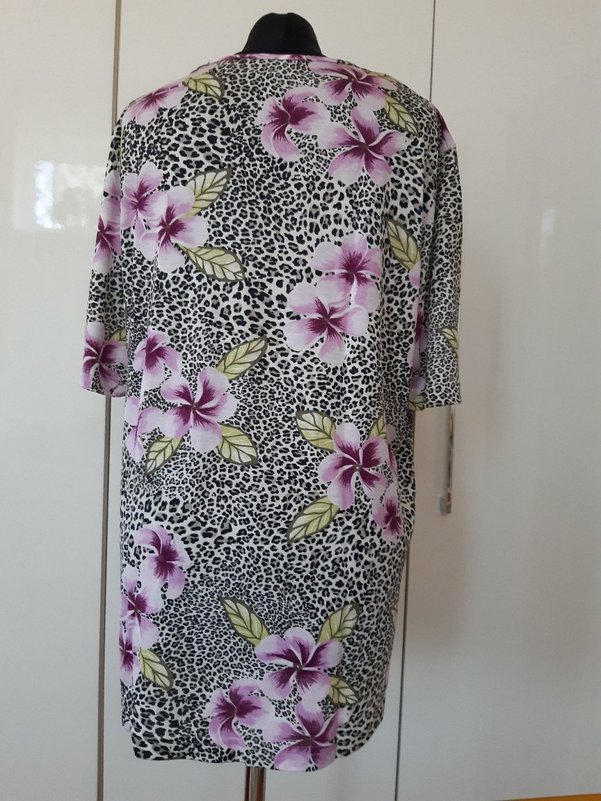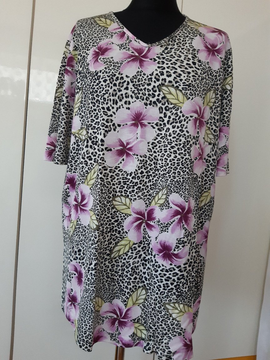 Pekné tričko s ružovými až lilavymi kvetmi. materiál- kvalitný-100% viskźa, nekrčivý, trochu elasticky. Dl. 74 cm, šírka cez prsia 62x2 cm. Nebadať známky použitia. Udávaná veľkosť je 4ž, podľa mňa skôr 48, ale potrebné je premerať sa. Tričko ,alebo blúzka je v perfektnom stave.