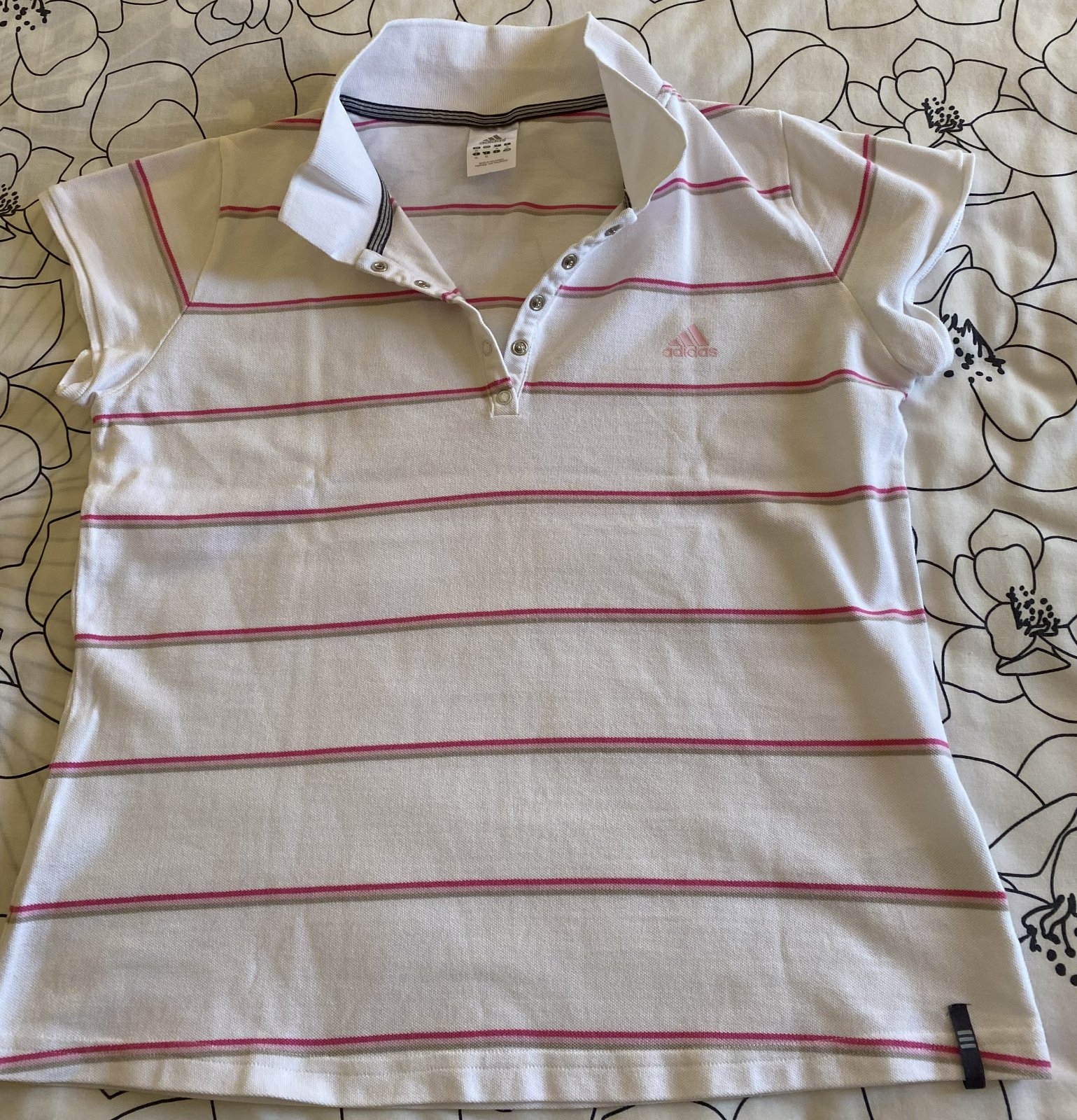Dámske bavlnené polotričko Adidas s pásikmi v. 38 - M, materiál 100% bavlna, základná farba pekná biela, ružové logo, pásiky ako na foto - viď detail., asi 3x oblečené, vo veľmi dobrom stave. Miery merané v kľude: dĺžka od krku dolu: 57cm, šírka v podpazuší: 47cmx2, šírka dolu - spodná časť: 50cmx2.