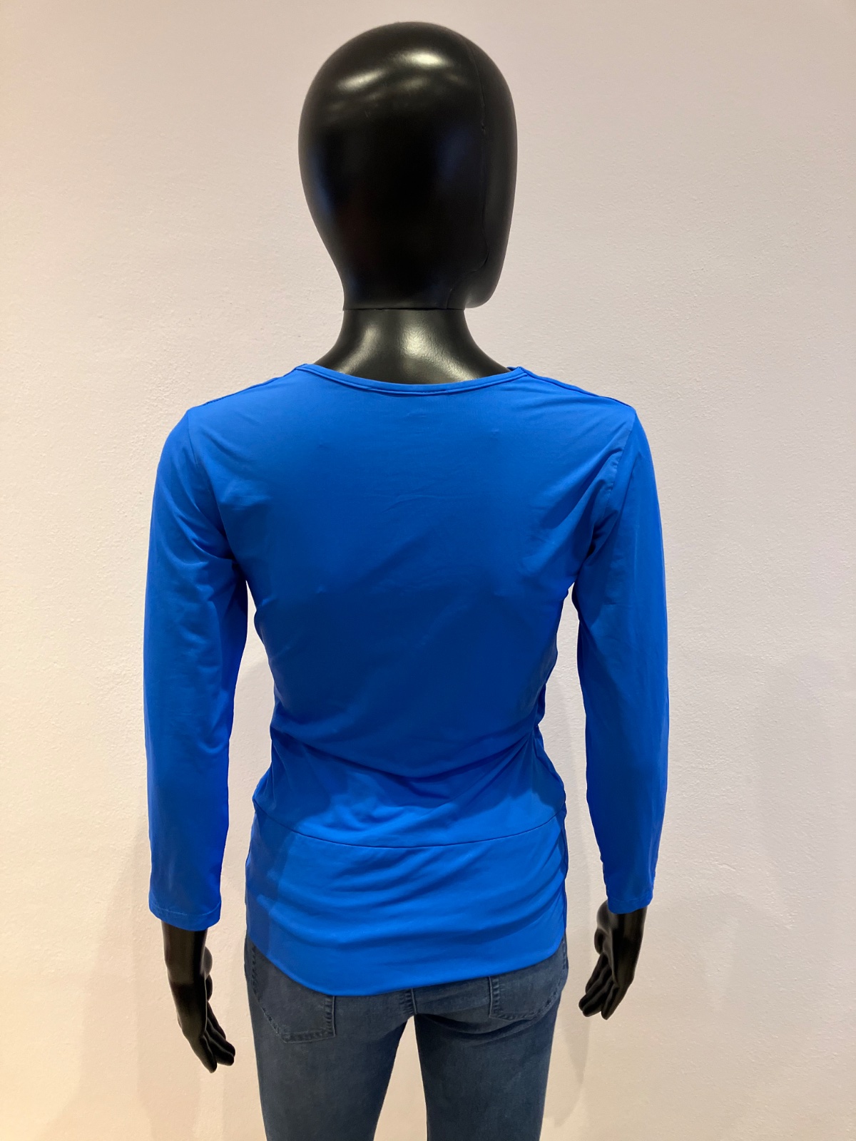 Dámske kráľovskomodré tričko s trojštvrťovým rukávom, prekrížené, nazberkané, elastické, materiál 92%polyamid 8%elastan.
