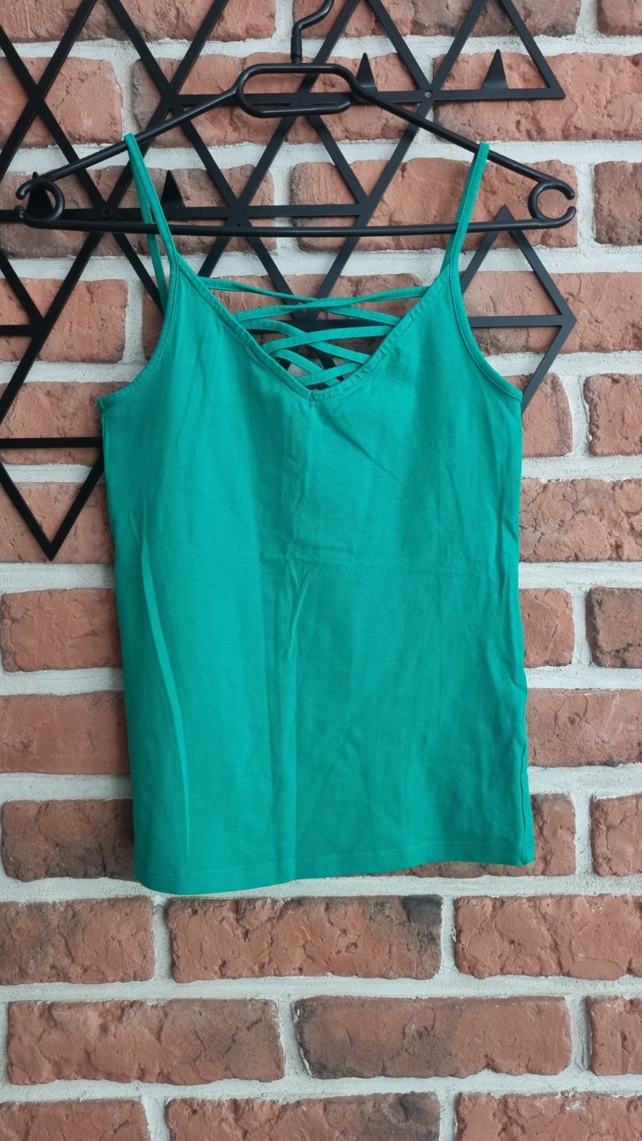 Vzorované zeleno-biele tielko, oblečené 2-3 krát, bez poškodení. Píše veľkosť XS, ale sedí aj na S. Rozmery : Dĺžka bez ramienok 49 cm Šírka pod pazuchami 31 cm, natiahne sa na 40 cm