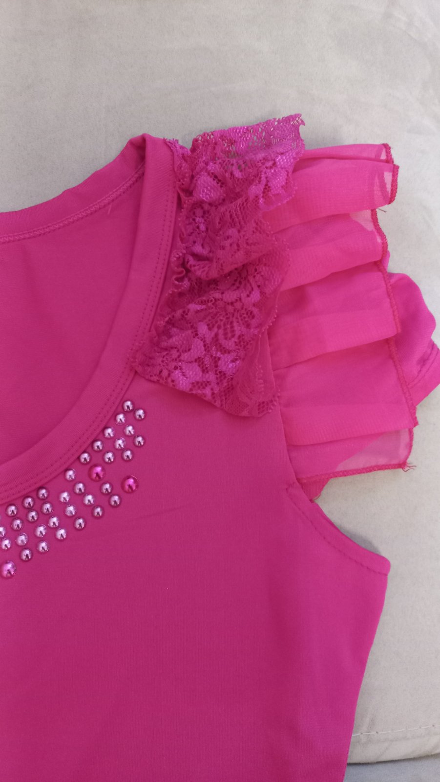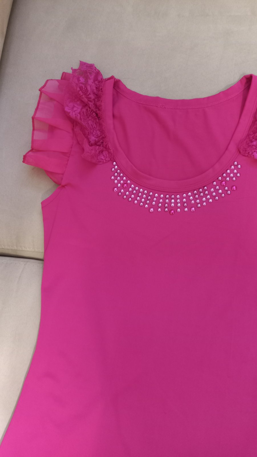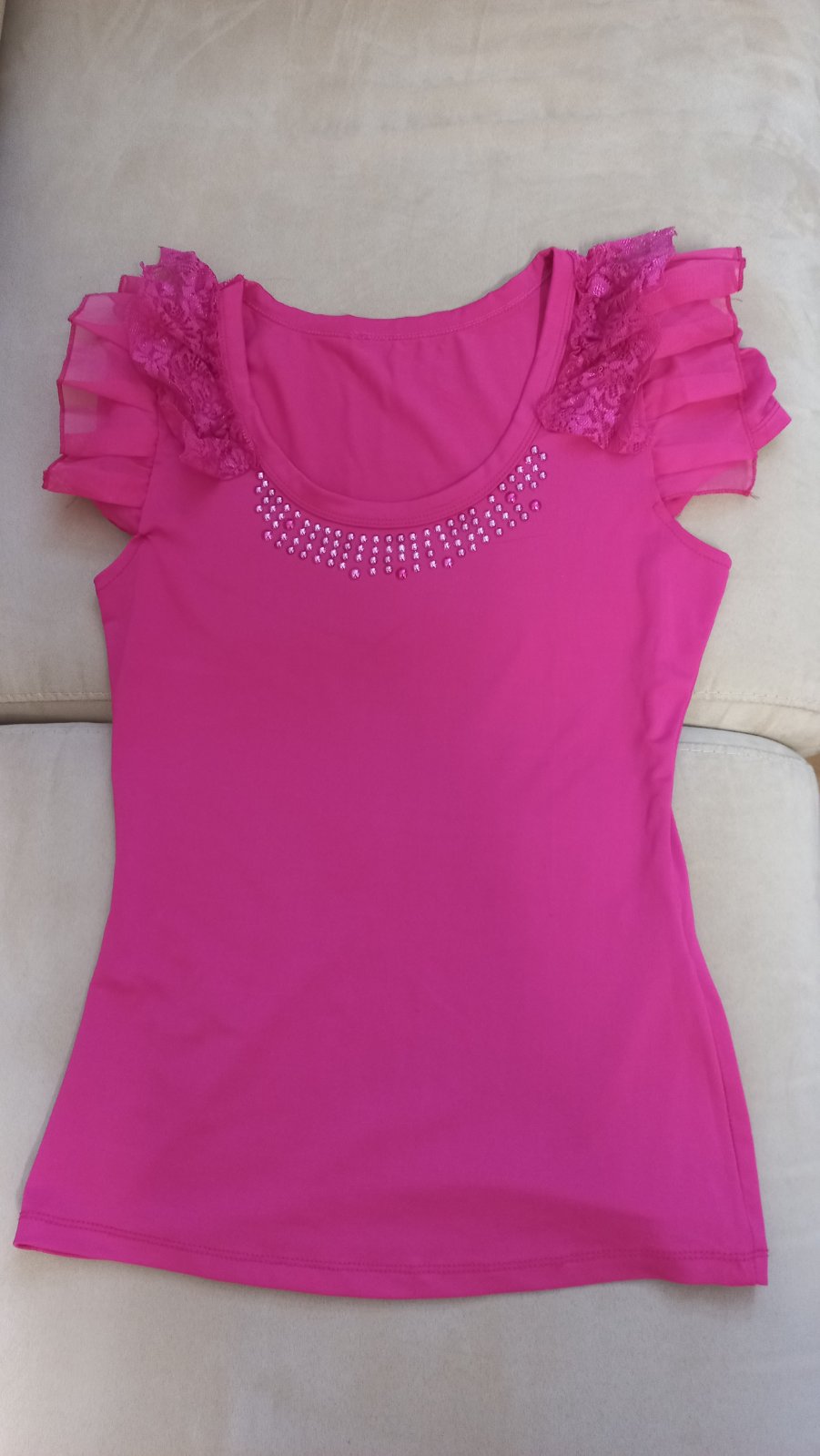 Pekné ružové tričko s kamienkami vpredu .61 cm dĺžka, 41 cm šírka pod pazuchami .