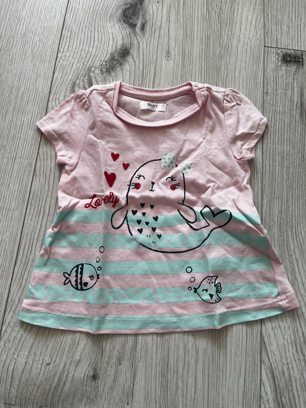 Predám bledoružové tričko s krátkym rukávom s obrázkom rybky, značka: Baby, veľkosť: 74