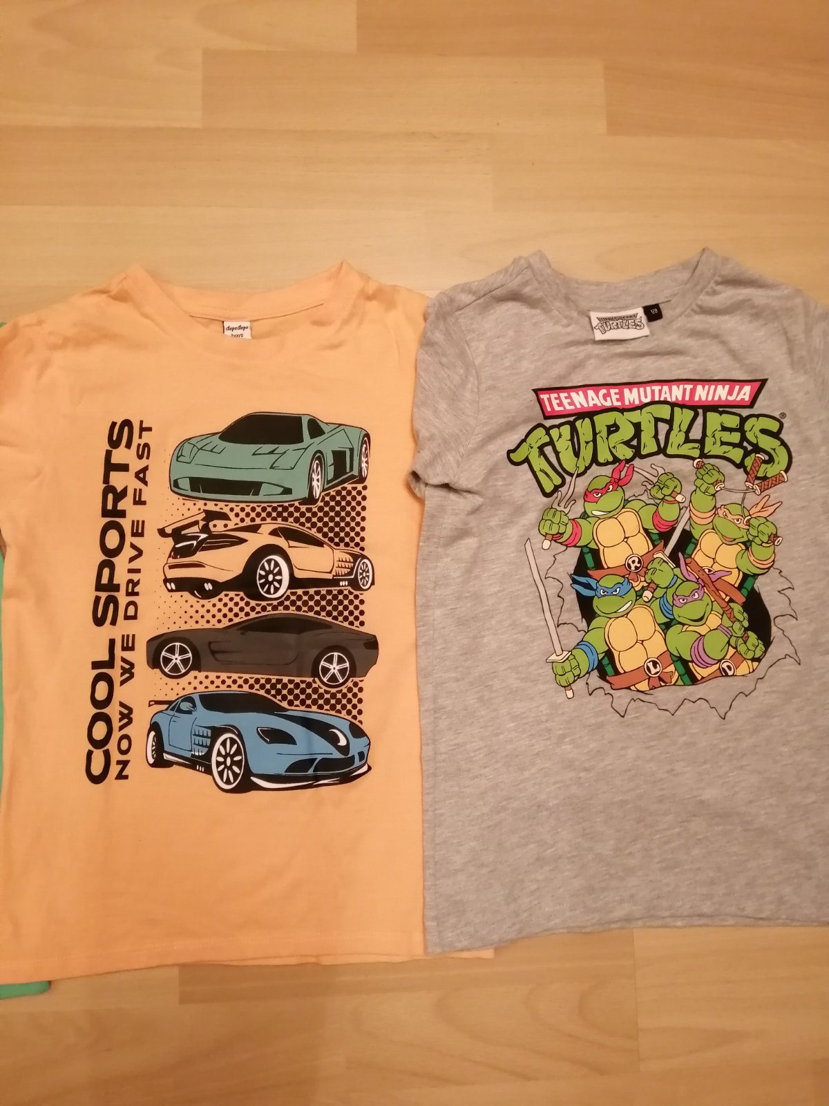 Veľmi pekný stav, bavlnené, príjemné na nosenie, Labkova parola zelené, autíčkove jemne oranžové, ninja korytnačky sivé, všetky aplikácie nepoškodené. Cena spolu plus pošta.