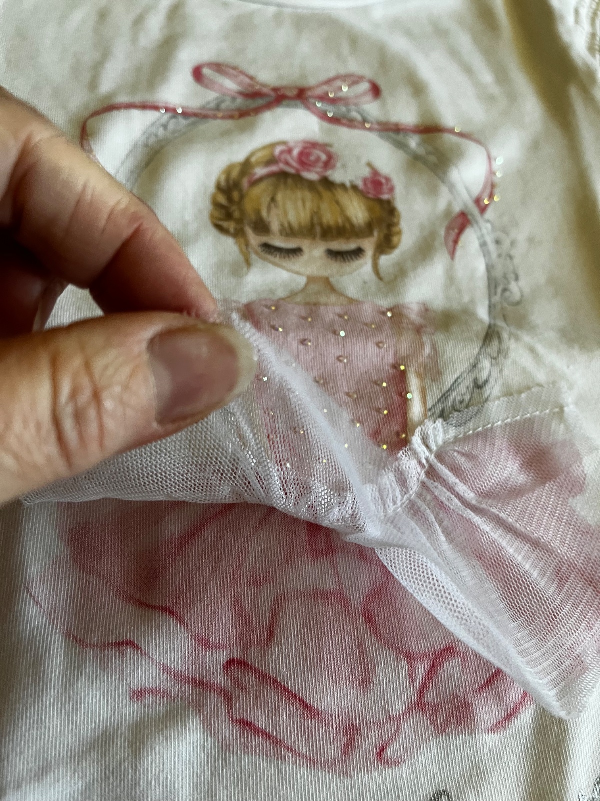 Vpredu je motív dievčatka s 3D šifónovou sukničkou a ozdobnými striebornými kamienkami.